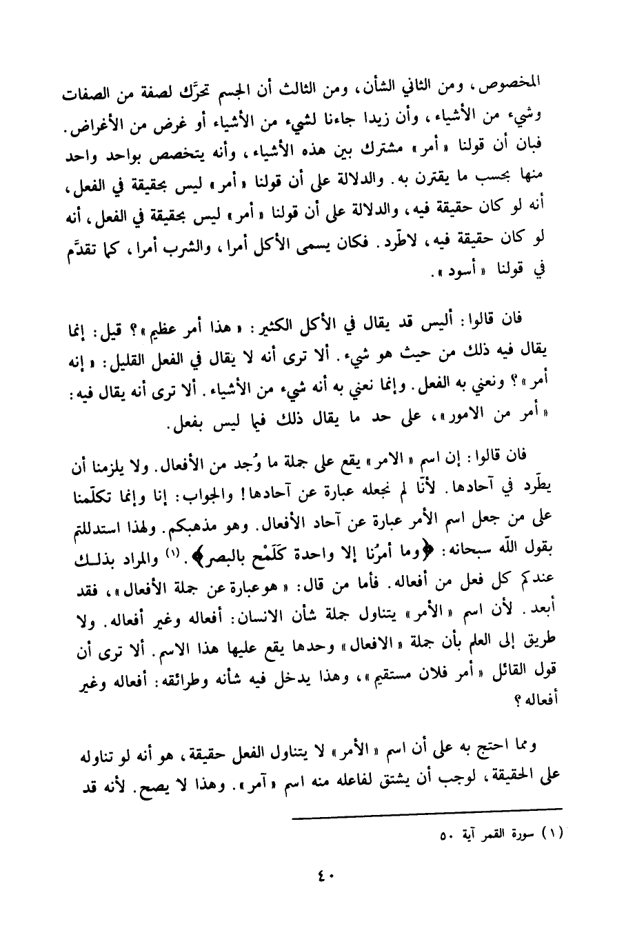 فان قَالُوا إِن اسْم الامر يَقع على جملَة مَا وجد من الْأَفْعَال وَلَا يلْزمنَا أَن يطرد فِي آحادها لأَنا لم نجعله عبارَة عَن آحادها وَالْجَوَاب إِنَّا وَإِنَّمَا تكلمنا على من جعل اسْم الْأَمر عبارَة عَن آحَاد الْأَفْعَال وَهُوَ مذهبكم وَلِهَذَا استدللتم بقول الله سُبْحَانَهُ {وَمَا أمرنَا إِلَّا وَاحِدَة كلمح بالبصر} وَالْمرَاد بذلك عنْدكُمْ كل فعل من أَفعاله فَأَما من قَالَ هُوَ عبارَة عَن جملَة الْأَفْعَال فقد أبعد أَن اسْم الْأَمر يتَنَاوَل جملَة شَأْن الانسان أَفعاله وَغير أَفعاله وَلَا طَرِيق إِلَى الْعلم بَان جملَة الافعال وَحدهَا يَقع عَلَيْهَا هَذَا الِاسْم أَلا ترى أَن قَول الْقَائِل أَمر فلَان مُسْتَقِيم وَهَذَا يدْخل فِيهِ شَأْنه وطرائقه أَفعاله وَغير أَفعاله