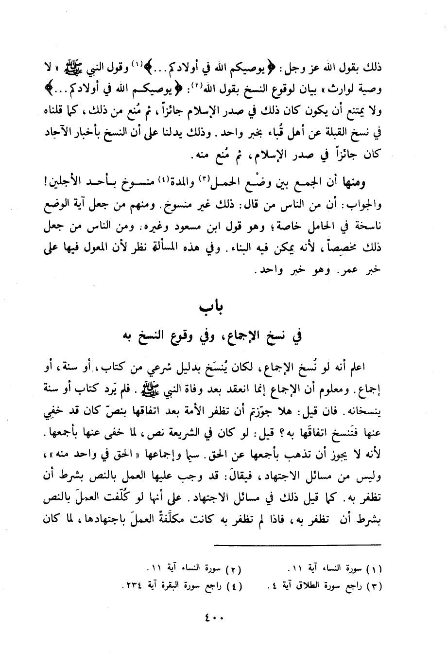 وَمِنْهَا أَن الْجمع بَين وضع الْحمل والمدة مَنْسُوخ بِأحد الْأَجَليْنِ وَالْجَوَاب أَن من النَّاس من قَالَ ذَلِك غير مَنْسُوخ وَمِنْهُم من جعل آيَة الْوَضع ناسخة فِي الْحَامِل خَاصَّة وَهُوَ قَول ابْن مَسْعُود وَغَيره وَمن النَّاس من جعل ذَلِك مُخَصّصا لِأَنَّهُ يُمكن فِيهِ الْبناء وَفِي هَذِه الْمَسْأَلَة نظر لِأَن الْمعول فِيهَا على خبر عمر وَهُوَ خبر وَاحِد - صَلَّى اللَّهُ عَلَيْهِ وَسَلَّم َ - بَاب فِي نسخ الْإِجْمَاع وَفِي وُقُوع النّسخ بِهِ - صَلَّى اللَّهُ عَلَيْهِ وَسَلَّم َ -