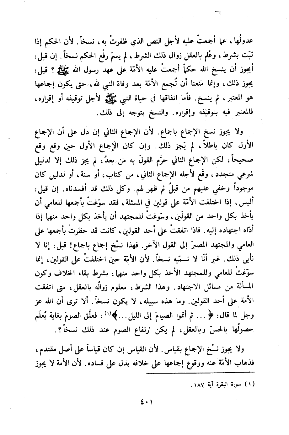 عدولها عَمَّا أَجمعت عَلَيْهِ لأجل النَّص الَّذِي ظَفرت بِهِ نسخا لِأَن الحكم إِذا ثَبت بِشَرْط وَعلم بِالْعقلِ زَوَال ذَلِك الشَّرْط لم يسم رفع الحكم نسخا إِن قيل ايجوز أَن ينْسَخ الله حكما أَجمعت عَلَيْهِ الْأمة على عهد رَسُول الله صلى الله عَلَيْهِ وَسلم قيل يجوز ذَلِك وَإِنَّمَا منعنَا أَن تجمع الْأمة بعد وَفَاة النَّبِي لله حَتَّى يكون إجماعها هُوَ الْمُعْتَبر ثمَّ ينْسَخ فَأَما اتفاقها فِي حَيَاة النَّبِي صلى الله عَلَيْهِ وَسلم لأجل توقيفه أَو إِقْرَاره فَالْمُعْتَبر فِيهِ بِتَوْقِيفِهِ وَإِقْرَاره والنسخ يتَوَجَّه إِلَى ذَلِك