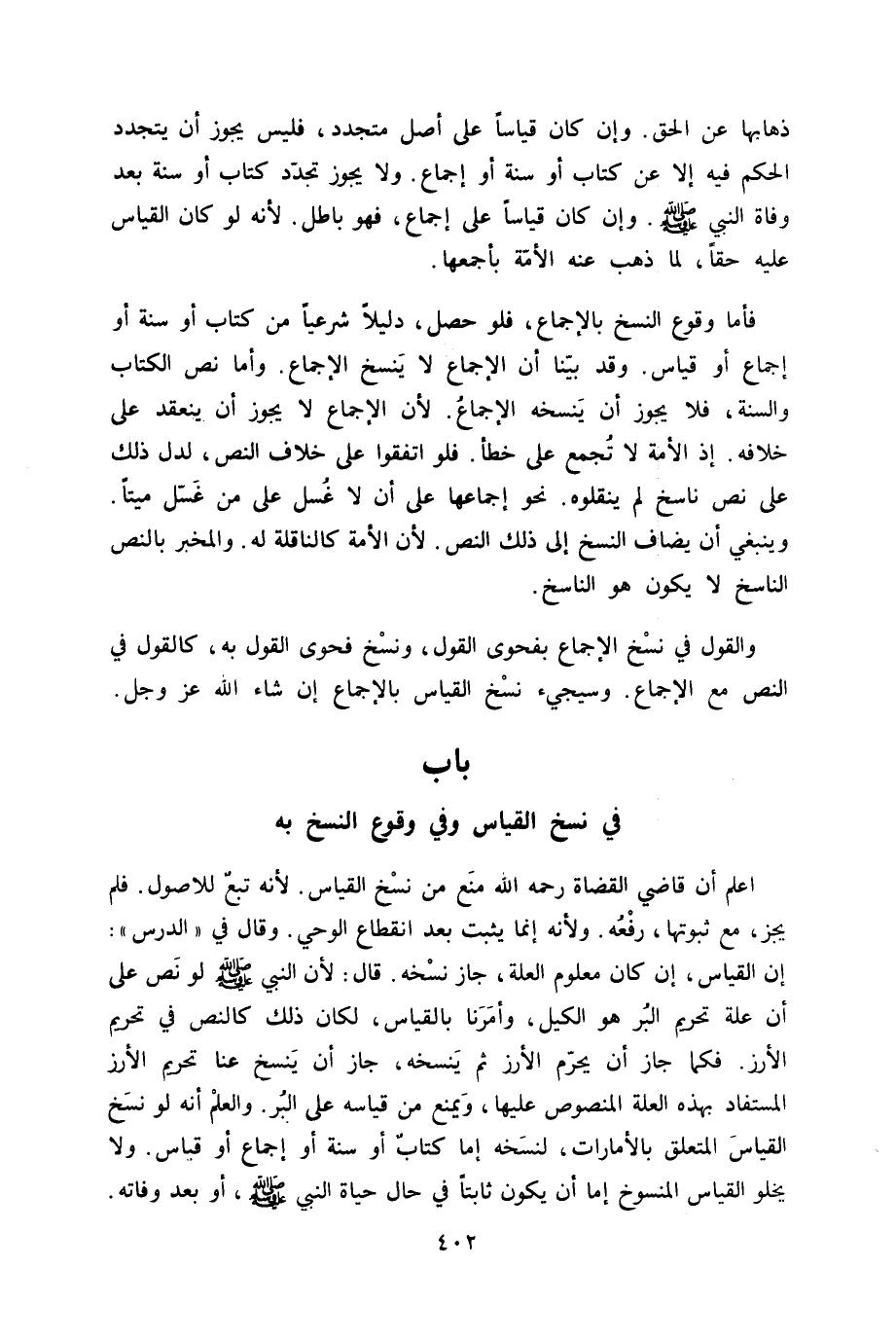 وَالْقَوْل فِي نسخ الْإِجْمَاع بفحوى القَوْل وَنسخ فحوى القَوْل بِهِ كالقول فِي النَّص مَعَ الْإِجْمَاع وَسَيَجِيءُ نسخ الْقيَاس بِالْإِجْمَاع إِن شَاءَ الله عز وَجل - صَلَّى اللَّهُ عَلَيْهِ وَسَلَّم َ - بَاب فِي نسخ الْقيَاس وَفِي وُقُوع النّسخ بِهِ - صَلَّى اللَّهُ عَلَيْهِ وَسَلَّم َ -