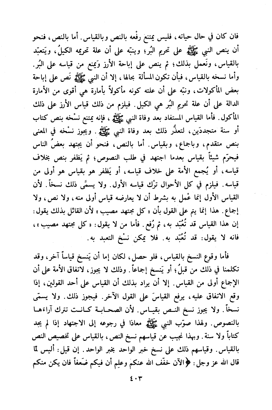فان كَانَ فِي حَال حَيَاته فَلَيْسَ يمْتَنع رَفعه بِالنَّصِّ وبالقياس أما بِالنَّصِّ فنحو أَن ينص النَّبِي صلى الله عَلَيْهِ وَسلم على تَحْرِيم الْبر وينبه على أَن عِلّة تَحْرِيمه الْكَيْل ويتعبد بِالْقِيَاسِ ونعمل بذلك ثمَّ ينص على إِبَاحَة الْأرز وَيمْنَع من قِيَاسه على الْبر وَأما نسخه بِالْقِيَاسِ فبأن تكون الْمَسْأَلَة بِحَالِهَا إِلَّا أَن النَّبِي صلى الله عَلَيْهِ وَسلم نَص على إِبَاحَة بعض المأكولات وَنبهَ على أَن علته كَونه مَأْكُولا بأمارة هِيَ أقوى من الأمارة الدَّالَّة على أَن عِلّة تَحْرِيم الْبر هِيَ الْكَيْل فَيلْزم من ذَلِك قِيَاس الْأرز على ذَلِك الْمَأْكُول فَأَما الْقيَاس الْمُسْتَفَاد بعد وَفَاة النَّبِي صلى الله عَلَيْهِ وَسلم فَإِنَّهُ يمْتَنع نسخه بِنَصّ كتاب أَو سنة متجددين لتعذر ذَلِك بعد وَفَاة النَّبِي صلى الله عَلَيْهِ وَسلم وَيجوز نسخه فِي الْمَعْنى بِنَصّ مُتَقَدم وباجماع وبقياس أما بِالنَّصِّ فنحو أَن يجْتَهد بعض النَّاس فَيحرم شَيْئا بِقِيَاس بَعْدَمَا اجْتهد فِي طلب النُّصُوص ثمَّ يظفر بِنَصّ بِخِلَاف قِيَاسه أَو يجمع الْأمة على خلاف قِيَاسه أَو يظفر هُوَ بِقِيَاس أولى من قِيَاسه فَيلْزم فِي كل الْأَحْوَال ترك قِيَاسه الأول وَلَا يُسمى ذَلِك نسخا لِأَن الْقيَاس الأول إِنَّمَا عمل بِهِ بِشَرْط أَن لَا يُعَارضهُ قِيَاس أولى مِنْهُ وَلَا نَص وَلَا إِجْمَاع هَذَا إِنَّمَا يتم على القَوْل بِأَن كل مُجْتَهد مُصِيب لِأَن الْقَائِل بذلك يَقُول إِن هَذَا الْقيَاس قد تعبد بِهِ ثمَّ رفع فَأَما من لَا يَقُول كل مُجْتَهد مُصِيب فانه لَا يَقُول قد تعبد بِهِ فَلَا يُمكن نسخ التَّعَبُّد بِهِ