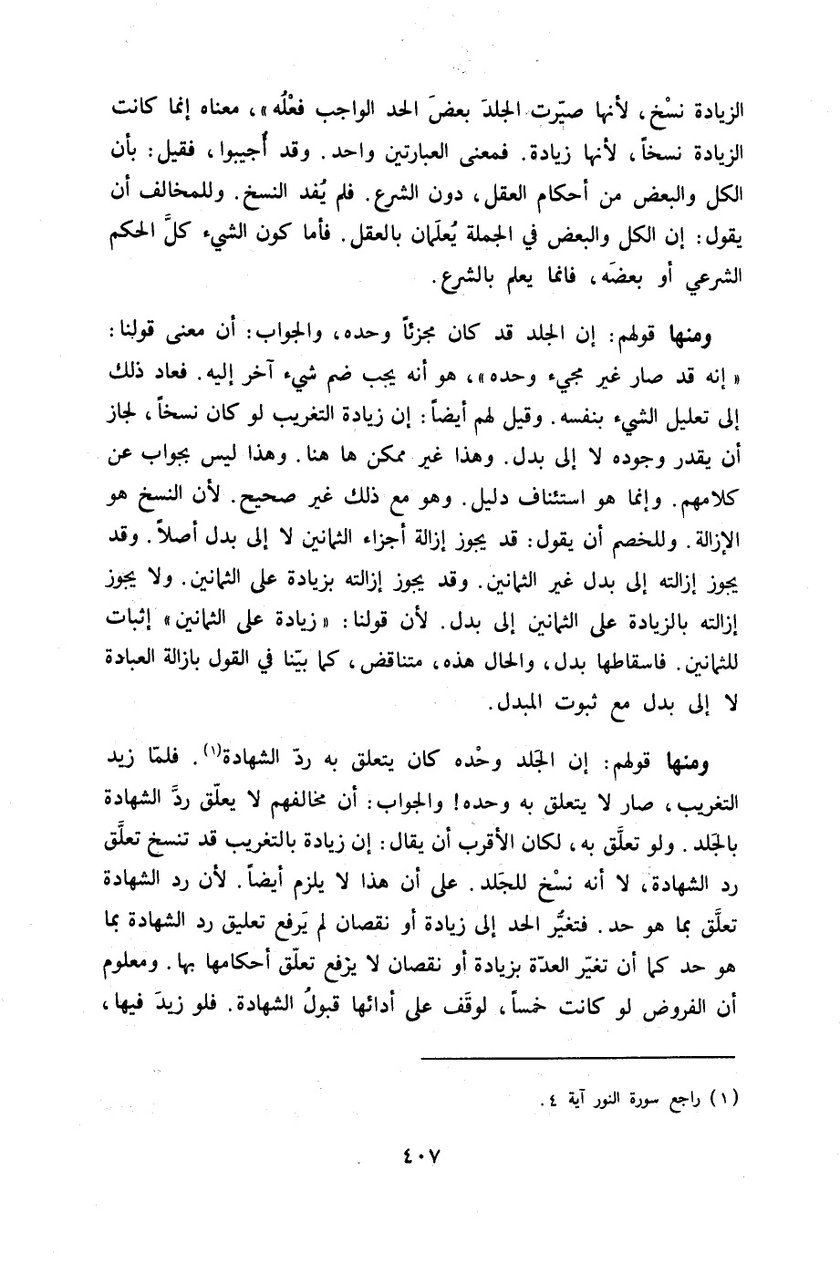 الزِّيَادَة نسخ لِأَنَّهَا صيرت الْجلد بعض الْحَد الْوَاجِب فعله مَعْنَاهُ إِنَّمَا كَانَت الزِّيَادَة نسخا لِأَنَّهَا زِيَادَة فَمَعْنَى العبارتين وَاحِد وَقد أجِيبُوا فَقيل بِأَن الْكل وَالْبَعْض من أَحْكَام الْعقل دون الشَّرْع فَلم يفد النّسخ وللمخالف أَن يَقُول إِن الْكل وَالْبَعْض فِي الْجُمْلَة يعلمَانِ بِالْعقلِ فَأَما كَون الشَّيْء كل الحكم الشَّرْعِيّ أَو بعضه فانما يعلم بِالشَّرْعِ