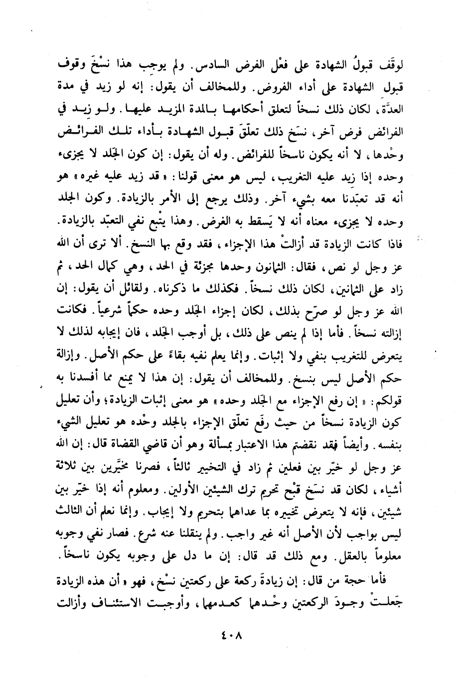 لوقف قبُول الشَّهَادَة على فعل الْفَرْض السَّادِس وَلم يُوجب هَذَا نسخ وقُوف قبُول الشَّهَادَة على أَدَاء الْفُرُوض وللمخالف أَن يَقُول إِنَّه لَو زيد فِي مُدَّة الْعدة لَكَانَ ذَلِك نسخا لتَعلق أَحْكَامهَا بالمدة الْمَزِيد عَلَيْهَا وَلَو زيد فِي الْفَرَائِض فرض آخر نسخ ذَلِك تعلق قبُول الشَّهَادَة بأَدَاء تِلْكَ الْفَرَائِض وَحدهَا لَا أَنه يكون نَاسِخا للفرائض وَله أَن يَقُول إِن كَون الْجلد لَا يجزىء وَحده إِذا زيد عَلَيْهِ التَّغْرِيب لَيْسَ هُوَ معنى قَوْلنَا قد زيد عَلَيْهِ غَيره هُوَ أَنه قد تعبدنا مَعَه بِشَيْء آخر وَذَلِكَ يرجع إِلَى الْأَمر بِالزِّيَادَةِ وَكَون الْجلد وَحده لَا يجزىء مَعْنَاهُ أَنه لَا يسْقط بِهِ الْغَرَض وَهَذَا يتبع نفي التَّعَبُّد بِالزِّيَادَةِ فاذا كَانَت الزِّيَادَة قد أزالت هَذَا الْإِجْزَاء فقد وَقع بهَا النّسخ أَلا ترى أَن الله عز وَجل لَو نَص فَقَالَ الثَّمَانُونَ وَحدهَا مجزئة فِي الْحَد وَهِي كَمَال الْحَد ثمَّ زَاد على الثَّمَانِينَ لَكَانَ ذَلِك نسخا فَكَذَلِك مَا ذَكرْنَاهُ وَلقَائِل أَن يَقُول إِن الله عز وَجل لَو صرح بذلك لَكَانَ إِجْزَاء الْجلد وَحده حكما شَرْعِيًّا فَكَانَت إِزَالَته نسخا فَأَما إِذا لم ينص على ذَلِك بل أوجب الْجلد فان إِيجَابه لذَلِك لَا يتَعَرَّض للتغريب بِنَفْي وَلَا إِثْبَات وَإِنَّمَا يعلم نَفْيه بَقَاء على حكم الأَصْل وَإِزَالَة حكم الأَصْل لَيْسَ بنسخ وللمخالف أَن يَقُول إِن هَذَا لَا يمْنَع مِمَّا أفسدنا بِهِ قَوْلكُم إِن رفع الْإِجْزَاء مَعَ الْجلد وَحده هُوَ معنى إِثْبَات الزِّيَادَة وَأَن تَعْلِيل كَون الزِّيَادَة نسخا من حَيْثُ رفع تعلق الْإِجْزَاء بِالْجلدِ وَحده هُوَ تَعْلِيل الشَّيْء بِنَفسِهِ وايضا فقد نقضتم هَذَا الِاعْتِبَار بِمَسْأَلَة وَهُوَ أَن قَاضِي الْقُضَاة قَالَ إِن الله عز وَجل لَو خير بَين فعلين ثمَّ زَاد فِي التَّخْيِير ثَالِثا فصرنا مخيرين بَين ثَلَاثَة أَشْيَاء لَكَانَ قد نسخ قبح تَحْرِيم ترك الشَّيْئَيْنِ الْأَوَّلين وَمَعْلُوم أَنه إِذا خير بَين شَيْئَيْنِ فَإِنَّهُ لَا يتَعَرَّض تخييره بِمَا عداهما بِتَحْرِيم وَلَا إِيجَاب وَإِنَّمَا نعلم أَن الثَّالِث لَيْسَ بِوَاجِب لِأَن الأَصْل أَنه غير وَاجِب وَلم ينقلنا عَنهُ شرع فَصَارَ نفي وُجُوبه مَعْلُوما بِالْعقلِ وَمَعَ ذَلِك قد قَالَ إِن مَا دلّ على وُجُوبه يكون نَاسِخا