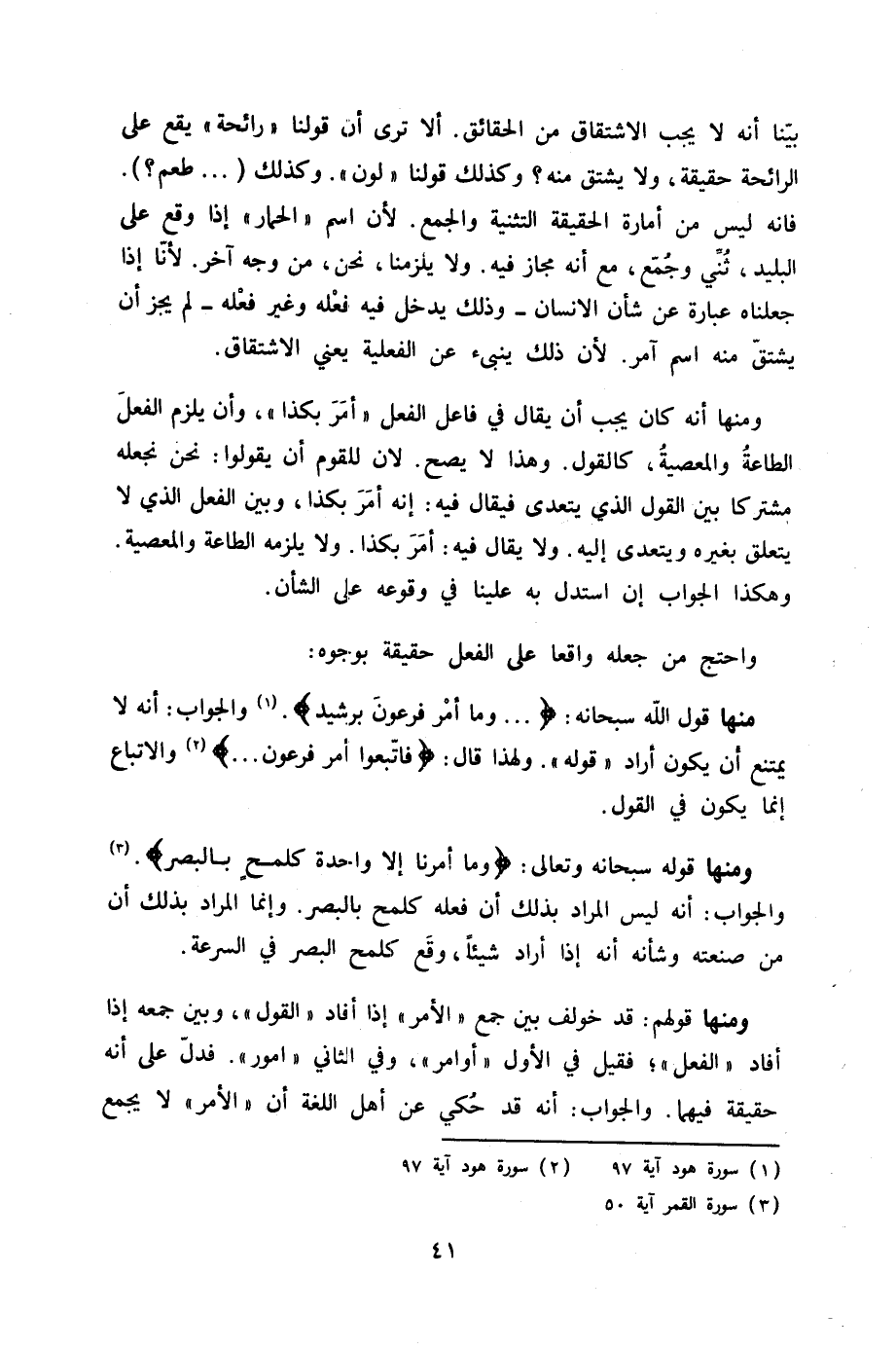 بَينا أَنه لَا يجب الِاشْتِقَاق من الْحَقَائِق أَلا ترى أَن قَوْلنَا رَائِحَة يَقع على الرَّائِحَة حَقِيقَة وَلَا يشتق مِنْهُ وَكَذَلِكَ قَوْلنَا لون وَكَذَلِكَ طعم فانه لَيْسَ من أَمارَة الْحَقِيقَة التَّثْنِيَة وَالْجمع لِأَن اسْم الْحمار إِذا وَقع على البليد ثني وَجمع مَعَ أَنه مجَاز فِيهِ وَلَا يلْزمنَا نَحن من وَجه آخر لأَنا إِذا جَعَلْنَاهُ عبارَة عَن شَأْن الانسان وَذَلِكَ يدْخل فِيهِ فعله وَغير فعله لم يجز أَن يشتق مِنْهُ اسْم آمُر لِأَن ذَلِك ينبىء عَن الفعلية يَعْنِي الِاشْتِقَاق