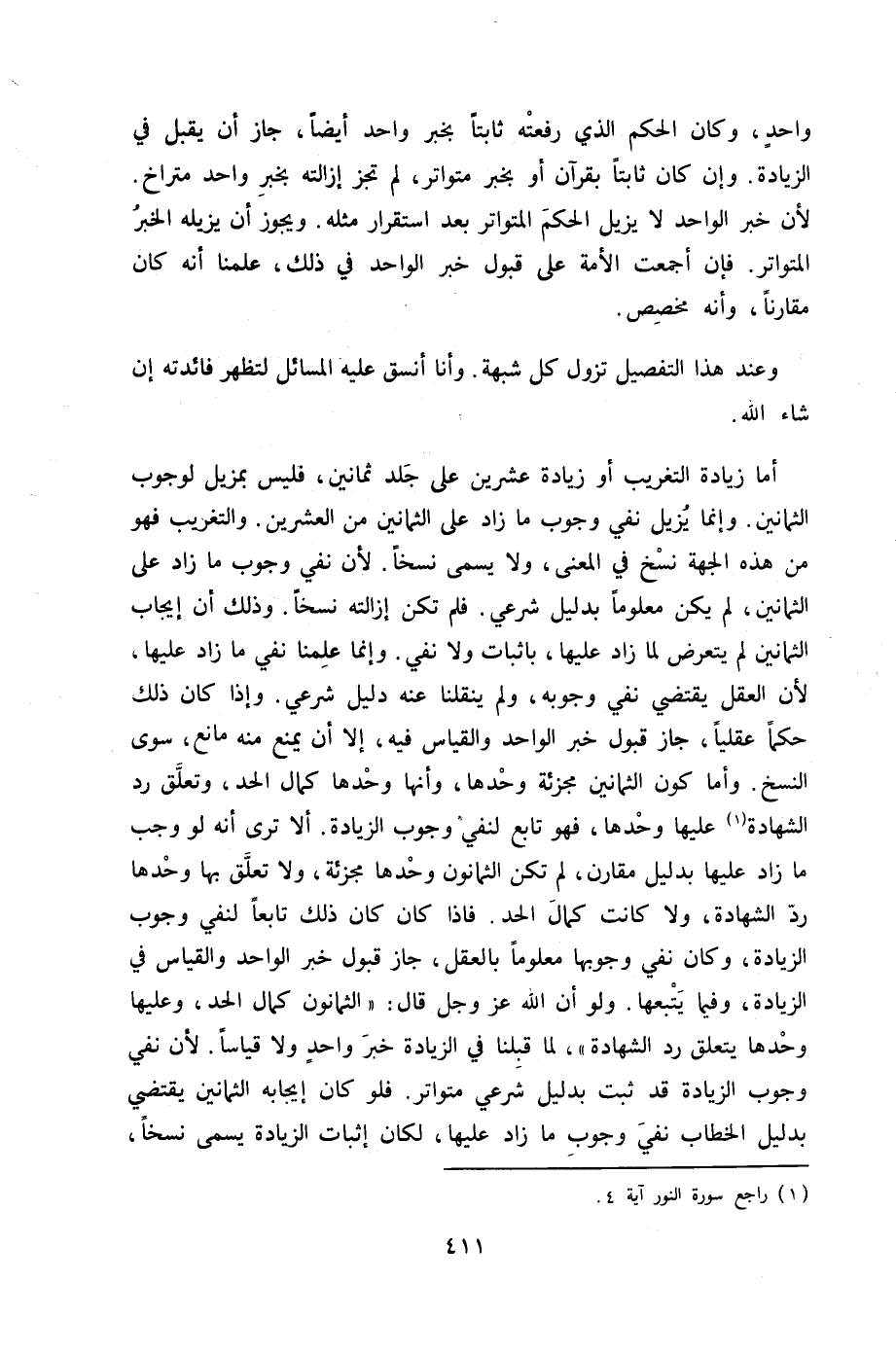 أما زِيَادَة التَّغْرِيب أَو زِيَادَة عشْرين على جلد ثَمَانِينَ فَلَيْسَ بمزيل لوُجُوب الثَّمَانِينَ وَإِنَّمَا يزِيل نفي وجوب مَا زَاد على الثَّمَانِينَ من الْعشْرين والتغريب فَهُوَ من هَذِه الْجِهَة نسخ فِي الْمَعْنى وَلَا يُسمى نسخا لِأَن نفي وجوب مَا زَاد على الثَّمَانِينَ لم يكن مَعْلُوما بِدَلِيل شَرْعِي فَلم تكن إِزَالَته نسخا وَذَلِكَ أَن إِيجَاب الثَّمَانِينَ لم يتَعَرَّض لما زَاد عَلَيْهَا باثبات وَلَا نفي وَإِنَّمَا علمنَا نفي مَا زَاد عَلَيْهَا لِأَن الْعقل يَقْتَضِي نفي وُجُوبه وَلم ينقلنا عَنهُ دَلِيل شَرْعِي وَإِذا كَانَ ذَلِك حكما عقليا جَازَ قبُول خبر الْوَاحِد وَالْقِيَاس فِيهِ إِلَّا أَن يمْنَع مِنْهُ مَانع سوى النّسخ وَأما كَون الثَّمَانِينَ مجزئة وَحدهَا وَأَنَّهَا وَحدهَا كَمَال الْحَد وَتعلق رد الشَّهَادَة عَلَيْهَا وَحدهَا فَهُوَ تَابع لنفي وجوب الزِّيَادَة أَلا ترى أَنه لَو وَجب مَا زَاد عَلَيْهَا بِدَلِيل مُقَارن لم تكن الثَّمَانُونَ وَحدهَا مجزئة وَلَا تعلق بهَا وَحدهَا رد الشَّهَادَة وَلَا كَانَت كَمَال الْحَد فاذا كَانَ كَانَ ذَلِك تَابعا لنفي وجوب الزِّيَادَة وَكَانَ نفي وُجُوبهَا مَعْلُوما بِالْعقلِ جَازَ قبُول خبر الْوَاحِد وَالْقِيَاس فِي الزِّيَادَة وَفِيمَا يتبعهَا وَلَو أَن الله عز وَجل قَالَ الثَّمَانُونَ كَمَال الْحَد وَعَلَيْهَا وَحدهَا يتَعَلَّق رد الشَّهَادَة لما قبلنَا فِي الزِّيَادَة خبر وَاحِد وَلَا قِيَاسا لِأَن نفي وجوب الزِّيَادَة قد ثَبت بِدَلِيل شَرْعِي متواتر فَلَو كَانَ إِيجَابه الثَّمَانِينَ يَقْتَضِي بِدَلِيل الْخطاب نفي وجوب مَا زَاد عَلَيْهَا لَكَانَ أثبات الزِّيَادَة يُسمى نسخا