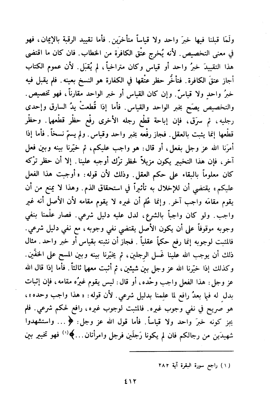 وَلما قبلنَا فِيهَا خبر وَاحِد وَلَا قِيَاسا متأخرين فَأَما تَقْيِيد الرَّقَبَة بِالْإِيمَان فَهُوَ فِي معنى التَّخْصِيص لِأَنَّهُ يخرج عتق الْكَافِرَة من الْخطاب فان كَانَ مَا اقْتضى هَذَا التَّقْيِيد خبر وَاحِد أَو قِيَاس وَكَانَ متراخيا لم يقبل لِأَن عُمُوم الْكتاب أجَاز عتق الْكَافِرَة فَتَأَخر حظر عتقهَا فِي الْكَفَّارَة هُوَ النّسخ بِعَيْنِه فَلم يقبل فِيهِ خبر وَاحِد وَلَا قِيَاس وَإِن كَانَ الْقيَاس أَو خبر الْوَاحِد مُقَارنًا فَهُوَ تَخْصِيص والتخصيص يَصح بِخَبَر الْوَاحِد وَالْقِيَاس فَأَما إِذا قطعت يَد السَّارِق وَإِحْدَى رجلَيْهِ ثمَّ سرق فَإِن إِبَاحَة قطع رجله الْأُخْرَى رفع حظر قطعهمَا وحظر قطعهَا إِنَّمَا يثبت يالعقل فَجَاز رَفعه بِخَبَر وَاحِد وَقِيَاس وَلم يسم نسخا فَأَما إِذا أمرنَا الله عز وَجل بِفعل أَو قَالَ هُوَ وَاجِب عَلَيْكُم ثمَّ خيرنا بَينه وَبَين فعل آخر فَإِن هَذَا التَّخْيِير يكون مزيلا لحظر ترك أوجبه علينا إِلَّا أَن حظر تَركه كَانَ مَعْلُوما بِالْبَقَاءِ على حكم الْعقل وَذَلِكَ لِأَن قَوْله أوجبت هَذَا الْفِعْل عَلَيْكُم يَقْتَضِي أَن للإخلال بِهِ تَأْثِيرا فِي اسْتِحْقَاق الذَّم وَهَذَا لَا يمْنَع من أَن يقوم مقَامه وَاجِب آخر وَإِنَّمَا علم أَن غَيره لَا يقوم مقَامه لِأَن الأَصْل أَنه غير وَاجِب وَلَو كَانَ وَاجِبا بِالشَّرْعِ لدل عَلَيْهِ دَلِيل شَرْعِي فَصَارَ علمنَا بِنَفْي وُجُوبه مَوْقُوفا على أَن يكون الأَصْل يَقْتَضِي نفي وُجُوبه مَعَ نفي دَلِيل شَرْعِي فالمثبت لوُجُوبه إِنَّمَا رفع حكما عقليا فَجَاز أَن نثبته بِقِيَاس أَو خبر وَاحِد مِثَال ذَلِك أَن يُوجب الله علينا غسل الرجلَيْن ثمَّ يخيرنا بَينه وَبَين الْمسْح على الْخُفَّيْنِ وَكَذَلِكَ إِذا خيرنا الله عز وَجل بَين شَيْئَيْنِ ثمَّ أثبت مَعَهُمَا ثَالِثا فَأَما إِذا قَالَ الله عز وَجل هَذَا الْفِعْل وَاجِب وَحده أَو قَالَ لَيْسَ يقوم غَيره مقَامه فَإِن إِثْبَات بدل لَهُ فِيمَا بعد رَافع لما علمنَا بِدَلِيل شَرْعِي لِأَن قَوْله هَذَا وَاجِب وَحده هُوَ صَرِيح فِي نفي وجوب غَيره فالمثبت لوُجُوب غَيره رَافع لحكم شَرْعِي فَلم يجز كَونه خبر وَاحِد وَلَا قِيَاسا فَأَما قَول الله عز وَجل {واستشهدوا شهيدين من رجالكم فَإِن لم يَكُونَا رجلَيْنِ فَرجل وَامْرَأَتَانِ} فَهُوَ تَخْيِير بَين