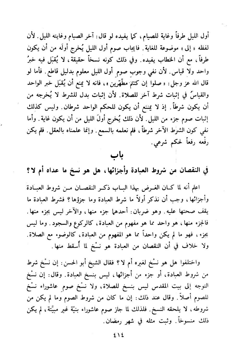 أول اللَّيْل طرفا وَغَايَة للصيام كَمَا يفِيدهُ لَو قَالَ آخر الصّيام وغايته اللَّيْل لِأَن لَفظه إِلَى مَوْضُوعَة للغاية فايجاب صَوْم أول اللَّيْل يخرج أَوله من أَن يكون طرفا مَعَ أَن الْخطاب يفِيدهُ وَفِي ذَلِك كَونه نسخا حَقِيقَة لَا يقبل فِيهِ خبر وَاحِد وَلَا قِيَاس لِأَن نفي وجوب صَوْم أول اللَّيْل مَعْلُوم بِدَلِيل قَاطع فَأَما لَو قَالَ الله عز وَجل صلوا إِن كُنْتُم مطهرين فانه لَا يمْنَع أَن يقبل خبر الْوَاحِد وَالْقِيَاس فِي إِثْبَات شَرط آخر الصَّلَاة لِأَن إِثْبَات بدل للشّرط لَا يُخرجهُ من أَن يكون شرطا إِذْ لَا يمْتَنع أَن يكون للْحكم الْوَاحِد شَرْطَانِ وَلَيْسَ كَذَلِك إِثْبَات صَوْم جُزْء من اللَّيْل لِأَن ذَلِك يخرج أول اللَّيْل من أَن يكون غَايَة وَأما نفي كَون الشَّرْط الآخر شرطا فَلم نعلمهُ بِالسَّمْعِ وَإِنَّمَا علمناه بِالْعقلِ فَلم يكن رَفعه رفعا لحكم شَرْعِي - صَلَّى اللَّهُ عَلَيْهِ وَسَلَّم َ - بَاب فِي النُّقْصَان من شُرُوط الْعِبَادَة وأجزائها هَل هُوَ نسخ مَا عداهُ أم لَا - صَلَّى اللَّهُ عَلَيْهِ وَسَلَّم َ -