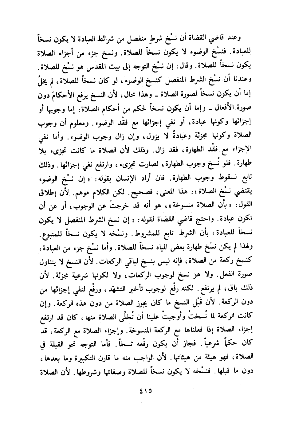 وَعند قَاضِي الْقُضَاة أَن نسخ شَرط مُنْفَصِل من شَرَائِط الْعِبَادَة لَا يكون نسخا لِلْعِبَادَةِ فنسخ الْوضُوء لَا يكون نسخا للصَّلَاة وَنسخ جُزْء من أَجزَاء الصَّلَاة يكون نسخا للصَّلَاة وَقَالَ إِن نسخ التَّوَجُّه إِلَى بَيت الْمُقَدّس هُوَ نسخ للصَّلَاة وَعِنْدنَا أَن نسخ الشَّرْط الْمُنْفَصِل كنسخ الة وضوء لَو كَانَ نسخا للصَّلَاة لم يخل إِمَّا أَن يكون نسخا لصورة الصَّلَاة وَهَذَا محَال لِأَن النّسخ يرفع الْأَحْكَام دون صُورَة الْأَفْعَال وَإِمَّا أَن يكون نسخا لحكم من احكام الصَّلَاة إِمَّا وُجُوبهَا أَو إجزائها وَكَونهَا عبَادَة أَو نفي إجزائها مَعَ فقد الْوضُوء وَمَعْلُوم أَن وجوب الصَّلَاة وَكَونهَا مجزئة وَعبادَة لَا يَزُول وَإِن زَالَ وجوب الْوضُوء وَأما نفي الْإِجْزَاء مَعَ فقد الطَّهَارَة فقد زَالَ وَذَلِكَ لِأَن الصَّلَاة مَا كَانَت تجزىء بِلَا طَهَارَة فَلَو نسخ وجوب الطَّهَارَة لَصَارَتْ تجزىء وارتفع نفي إجزائها وَذَلِكَ تَابع لسُقُوط وجوب الطَّهَارَة فان أَرَادَ الْإِنْسَان بقوله إِن نسخ الْوضُوء يَقْتَضِي نسخ الصَّلَاة هَذَا الْمَعْنى فَصَحِيح لَكِن الْكَلَام موهم لِأَن إِطْلَاق القَوْل بِأَن الصَّلَاة مَنْسُوخَة هُوَ أَنه قد خرجت عَن الْوُجُوب أَو عَن أَن تكون عبَادَة وَاحْتج قَاضِي الْقُضَاة لقَوْله إِن نسخ الشَّرْط الْمُنْفَصِل لَا يكون نسخا لِلْعِبَادَةِ بِأَن الشَّرْط تَابع للمشروط ونسخخه لَا يكون نسخا للمتبوع وَلِهَذَا لم يكن نسخ طَهَارَة بعض الْمِيَاه نسخه للصَّلَاة وَأما نسخ جُزْء من الْعِبَادَة كنسخ رَكْعَة من الصَّلَاة فَإِنَّهُ لَيْسَ بنسخ لباقي الرَّكْعَات لِأَن النّسخ لَا يتَنَاوَل صُورَة الْفِعْل وَلَا هُوَ نسخ لوُجُوب الرَّكْعَات وَلَا لكَونهَا شَرْعِيَّة مجزئة لِأَن ذَلِك بَاقٍ لم يرْتَفع لكنه رفع لوُجُوب تَأْخِير التَّشَهُّد وَرفع لنفي إجزائها من دون الرَّكْعَة لِأَن قبل النّسخ مَا كَانَ يجوز الصَّلَاة من دون هَذِه الرَّكْعَة وَإِن كَانَت الرَّكْعَة لما نسخت وأوجبت علينا أَن تخلى الصَّلَاة مِنْهَا كَانَ قد ارْتَفع إِجْزَاء الصَّلَاة إِذا فعلناها مَعَ الرَّكْعَة المنسوخة وإجزاء الصَّلَاة مَعَ الرَّكْعَة قد كَانَ حكما شَرْعِيًّا فَجَاز أَن يكون رَفعه نسخا فَأَما التَّوَجُّه نَحْو الْقبْلَة فِي الصَّلَاة فَهُوَ هَيْئَة من هيئاتها لِأَن الْوَاجِب مِنْهُ مَا قَارن التَّكْبِيرَة وَمَا بعْدهَا دون مَا قبلهَا فنسخه لَا يكون نسخا للصَّلَاة وصفاتها وشروطها لِأَن الصَّلَاة