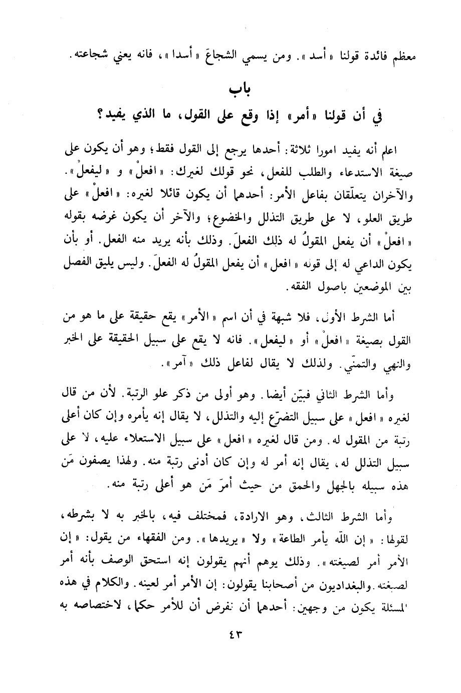 مُعظم فَائِدَة قَوْلنَا أَسد وَمن يُسَمِّي الشجاع أسدا فانه يَعْنِي شجاعته - صَلَّى اللَّهُ عَلَيْهِ وَسَلَّم َ - بَاب فِي أَن قَوْلنَا أَمر إِذا وَقع على القَوْل مَا الَّذِي يُفِيد - صَلَّى اللَّهُ عَلَيْهِ وَسَلَّم َ -