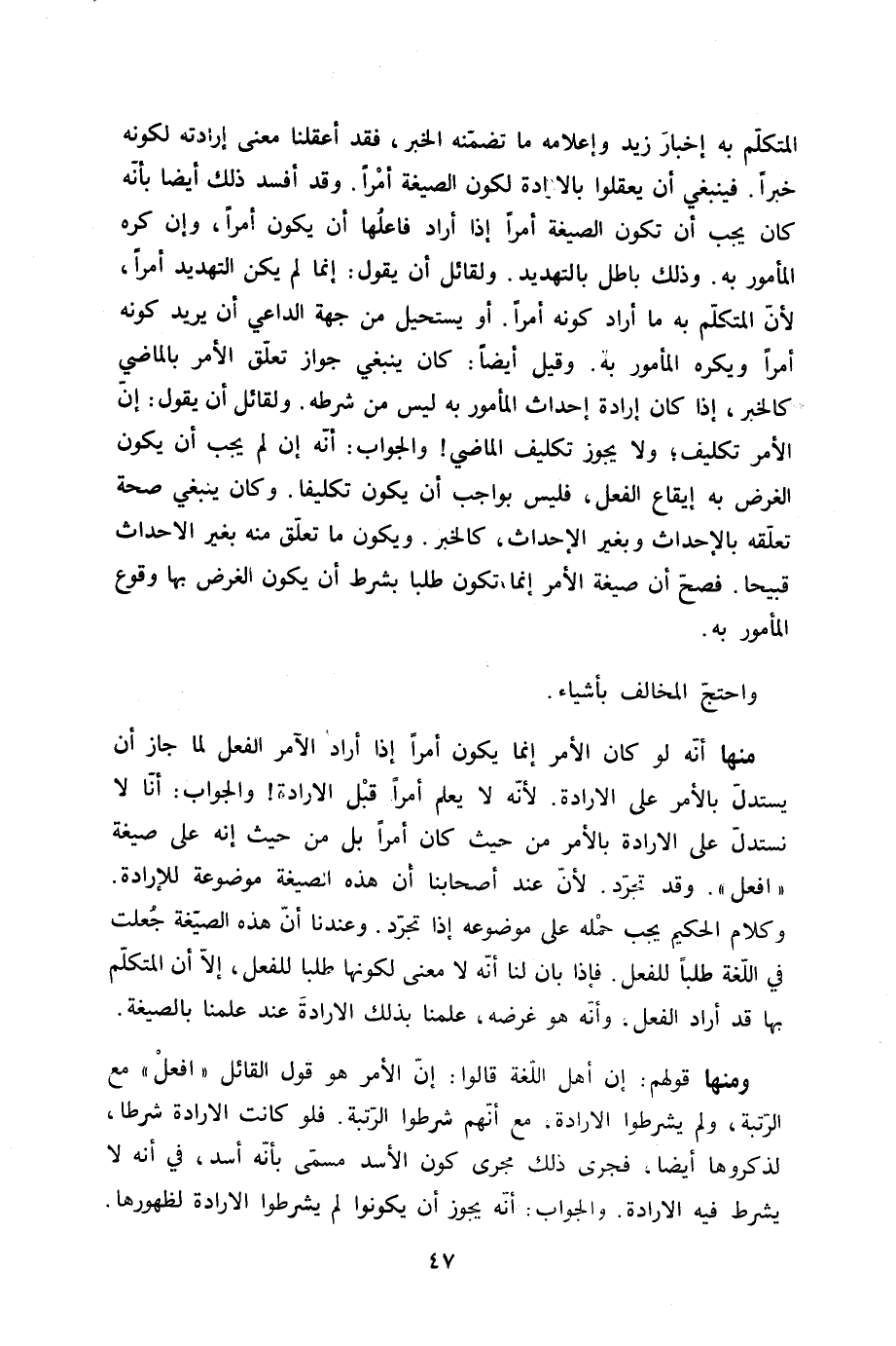مِنْهَا أَنه لَو كَانَ الْأَمر إِنَّمَا يكون أمرا إِذا أَرَادَ الْآمِر الْفِعْل لما جَازَ أَن يسْتَدلّ بِالْأَمر على الارادة لِأَنَّهُ لَا يعلم أمرا قبل الارادة وَالْجَوَاب أَنا لَا نستدل على الارادة بِالْأَمر من حَيْثُ كَانَ أمرا بل من حَيْثُ إِنَّه على صِيغَة افْعَل وَقد تجرد لِأَن عِنْد أَصْحَابنَا أَن هَذِه الصِّيغَة مَوْضُوعَة للإرادة وَكَلَام الْحَكِيم يجب حمله على مَوْضُوعه إِذا تجرد وَعِنْدنَا أَن هَذِه الصِّيغَة جعلت فِي اللُّغَة طلبا للْفِعْل فَإِذا بَان لنا أَنه لَا معنى لكَونهَا طلبا للْفِعْل إِلَّا أَن الْمُتَكَلّم بهَا قد أَرَادَ الْفِعْل وَأَنه هُوَ غَرَضه علمنَا بذلك الارادة عِنْد علمنَا بالصيغة