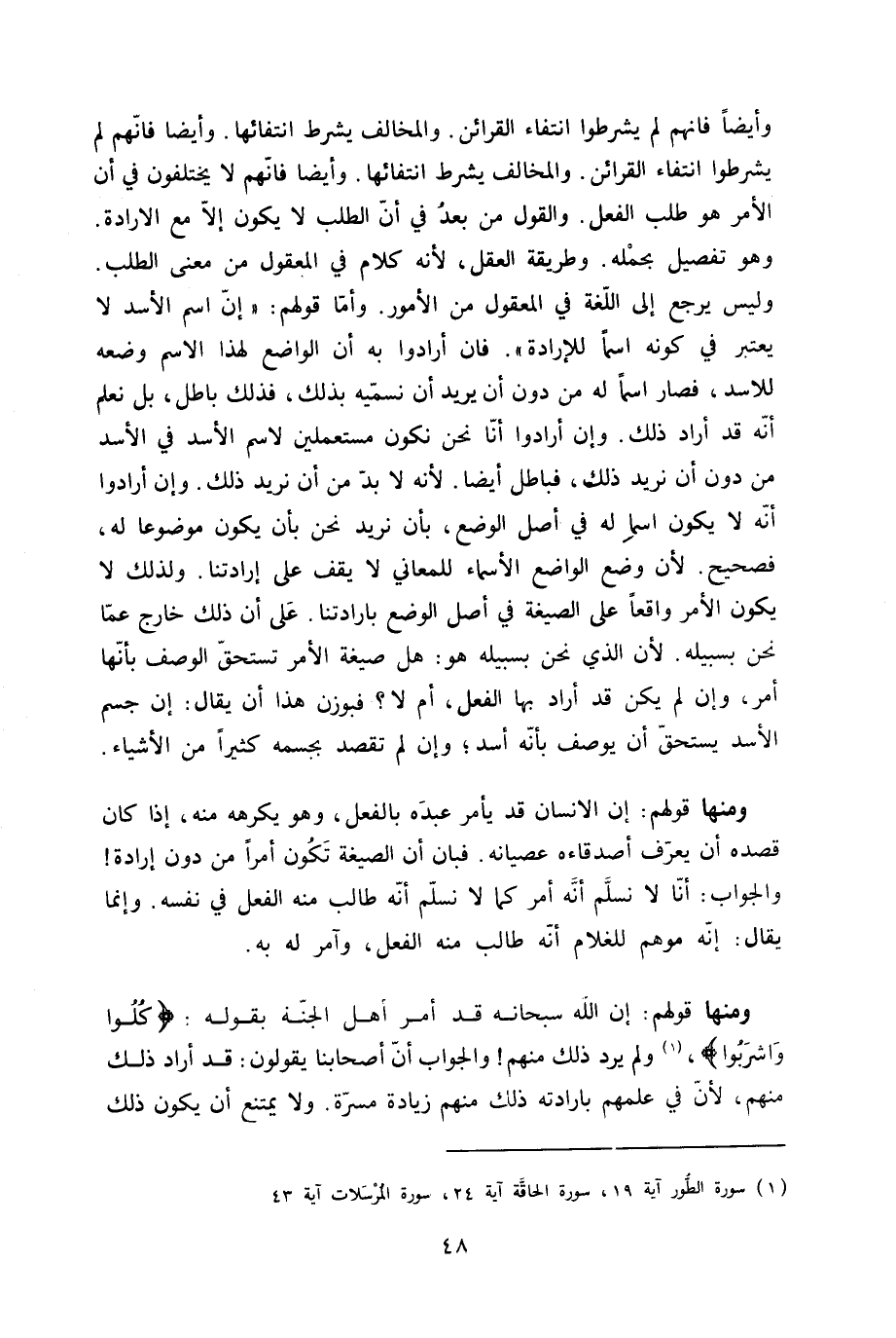وَأَيْضًا فانهم لم يشرطوا انْتِفَاء الْقَرَائِن والمخالف يشرط انتفائها وَأَيْضًا فانهم لم يشرطوا انْتِفَاء الْقَرَائِن والمخالف يشرط انتفائها وَأَيْضًا فانهم لَا يَخْتَلِفُونَ فِي أَن الْأَمر هُوَ طلب الْفِعْل وَالْقَوْل من بعد فِي أَن الطّلب لَا يكون إِلَّا مَعَ الارادة وَهُوَ تَفْصِيل بِحمْلِهِ وَطَرِيقَة الْعقل لِأَنَّهُ كَلَام فِي الْمَعْقُول من معنى الطّلب وَلَيْسَ يرجع إِلَى اللُّغَة فِي الْمَعْقُول من الْأُمُور وَأما قَوْلهم إِن اسْم الْأسد لَا يعْتَبر فِي كَونه اسْما للإرادة فان أَرَادوا بِهِ أَن الْوَاضِع لهَذَا الِاسْم وَضعه للاسد فَصَارَ اسْما لَهُ من دون أَن يُرِيد أَن نُسَمِّيه بذلك فَذَلِك بَاطِل بل نعلم انه قد أَرَادَ ذَلِك وَإِن أَرَادوا أَنا نَحن نَكُون مستعملين لاسم الْأسد فِي الْأسد من دون أَن نُرِيد ذَلِك فَبَاطِل أَيْضا لِأَنَّهُ لَا بُد من أَن نُرِيد ذَلِك وَإِن أَرَادوا أَنه لَا يكون اسْما لَهُ فِي أصل الْوَضع بِأَن نُرِيد نَحن بِأَن يكون مَوْضُوعا لَهُ فَصَحِيح لِأَن وضع الْوَاضِع الْأَسْمَاء للمعاني لَا يقف على إرادتنا وَلذَلِك لَا يكون الْأَمر وَاقعا على الصِّيغَة فِي أصل الْوَضع بارادتنا على ان ذَلِك خَارج عَمَّا نَحن بسبيله لِأَن الَّذِي نَحن بسبيله هُوَ هَل صِيغَة الْأَمر تسْتَحقّ الْوَصْف بِأَنَّهَا أَمر وَإِن لم يكن قد أَرَادَ بهَا الْفِعْل أم لَا فبوزن هَذَا أَن يُقَال إِن جسم الْأسد يسْتَحق أَن يُوصف بِأَنَّهُ أَسد وَإِن لم تقصد بجسمه كثيرا من الْأَشْيَاء