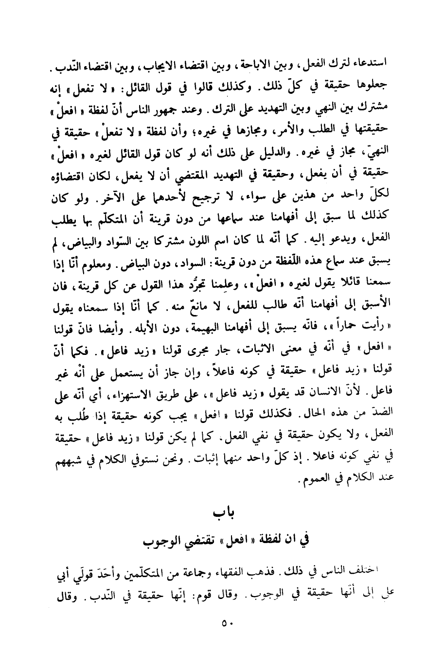 استدعاء لترك الْفِعْل وَبَين الاباحة وَبَين اقْتِضَاء الايجاب وَبَين اقْتِضَاء النّدب جعلوها حَقِيقَة فِي كل ذَلِك وَكَذَلِكَ قَالُوا فِي قَول الْقَائِل لَا تفعل إِنَّه مُشْتَرك بَين النَّهْي وَبَين التهديد على التّرْك وَعند جُمْهُور النَّاس أَن لَفْظَة افْعَل حَقِيقَتهَا فِي الطّلب وَالْأَمر ومجازها فِي غَيره وَأَن لَفْظَة لَا تفعل حَقِيقَة فِي النَّهْي مجَاز فِي غَيره وَالدَّلِيل على ذَلِك أَنه لَو كَانَ قَول الْقَائِل لغيره افْعَل حَقِيقَة فِي أَن يفعل وَحَقِيقَة فِي التهديد الْمُقْتَضِي أَن لَا يفعل لَكَانَ اقتضاؤه لكل وَاحِد من هذَيْن على سَوَاء لَا تَرْجِيح لأَحَدهمَا على الآخر وَلَو كَانَ كَذَلِك لما سبق إِلَى أفها منا عِنْد سماعهَا من دون قرينَة أَن الْمُتَكَلّم بهَا يطْلب الْفِعْل وَيَدْعُو إِلَيْهِ كَمَا أَنه لما كَانَ اسْم اللَّوْن مُشْتَركا بَين السوَاد وَالْبَيَاض لم يسْبق عِنْد سَماع هَذِه اللَّفْظَة من دون قرينَة السوَاد دون الْبيَاض وَمَعْلُوم أَنا إِذا سمعنَا قَائِلا يَقُول لغيره افْعَل وَعلمنَا تجرد هَذَا القَوْل عَن كل قرينَة فان الأسبق إِلَى أفهامنا أَنه طَالب للْفِعْل لَا مَانع مِنْهُ كَمَا أَنا إِذا سمعناه يَقُول رَأَيْت حمارا فانه يسْبق إِلَى أفهامنا الْبَهِيمَة دون الأبله وَأَيْضًا فان قَوْلنَا افْعَل فِي أَنه فِي معنى الاثبات جَار مجْرى قَوْلنَا زيد فَاعل فَكَمَا أَن قَوْلنَا زيد فَاعل حَقِيقَة فِي كَونه فَاعِلا وَإِن جَازَ ان يسْتَعْمل على انه غير فَاعل لِأَن الانسان قد يَقُول زيد فَاعل على طَرِيق الِاسْتِهْزَاء أَي أَنه على الضِّدّ من هَذِه الْحَال فَكَذَلِك قَوْلنَا افْعَل يجب كَونه حَقِيقَة إِذا طلب بِهِ الْفِعْل وَلَا يكون حَقِيقَة فِي نفي الْفِعْل كَمَا لم يكن قَوْلنَا زيد فَاعل حَقِيقَة فِي نفي كَونه فَاعِلا إِذْ كل وَاحِد مِنْهُمَا إِثْبَات وَنحن نستوفي الْكَلَام فِي شبههم عِنْد الْكَلَام فِي الْعُمُوم - صَلَّى اللَّهُ عَلَيْهِ وَسَلَّم َ - بَاب فِي أَن لَفْظَة افْعَل تَقْتَضِي الْوُجُوب - صَلَّى اللَّهُ عَلَيْهِ وَسَلَّم َ -