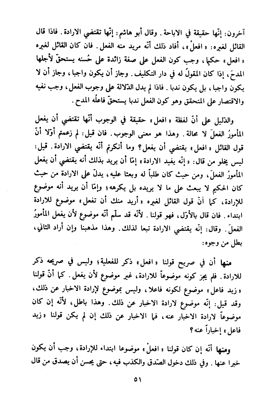 آخَرُونَ إِنَّهَا حَقِيقَة فِي الاباحة وَقَالَ أَبُو هَاشم إِنَّهَا تَقْتَضِي الارادة فَإِذا قَالَ الْقَائِل لغيره افْعَل أَفَادَ ذَلِك أَنه مُرِيد مِنْهُ الْفِعْل فان كَانَ الْقَائِل لغيره افْعَل حكيما وَجب كَون الْفِعْل على صفة زَائِدَة على حَسَنَة يسْتَحق لأَجلهَا الْمَدْح إِذا كَانَ الْمَقُول لَهُ فِي دَار التَّكْلِيف وَجَاز أَن يكون وَاجِبا وَجَاز أَن لَا يكون وَاجِبا بل يكون ندبا فَإِذا لم يدل الدّلَالَة على وجوب الْفِعْل وَجب نَفْيه والاقتصار على المتحقق وَهُوَ كَون الْفِعْل ندبا يسْتَحق فَاعله الْمَدْح