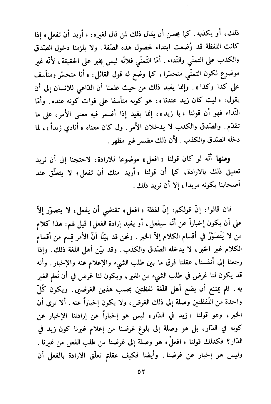 فان قَالُوا إِن قَوْلكُم إِن لَفْظَة افْعَل تَقْتَضِي أَن يفعل لَا يتَصَوَّر إِلَّا على ان يكون إِخْبَارًا عَن أَنه سيفعل أَو يُفِيد إِرَادَة الْفِعْل قيل لَهُم هَذَا كَلَام من لَا يتَصَوَّر فِي أَقسَام الْكَلَام إِلَّا الْخَبَر وَنحن قد بَينا أَن الْأَمر قسم من أَقسَام الْكَلَام غير الْخَبَر لَا يدْخلهُ الصدْق وَالْكذب وَقد بَين أهل اللُّغَة ذَلِك وَإِذا رَجعْنَا إِلَى أَنْفُسنَا عقلنا فرق مَا بَين طلب الشَّيْء والإعلام عَنهُ والإخبار وَأَنه قد يكون لنا غَرَض فِي طلب الشَّيْء من الْغَيْر وَيكون لنا غَرَض فِي أَن نعلم الْغَيْر بِهِ فَلم يمْتَنع أَن يضع أهل اللُّغَة لفظتين بِحَسب هذَيْن الغرضين وَيكون كل وَاحِدَة من اللفظتين وصلَة إِلَى ذَلِك الْغَرَض وَلَا يكون إِخْبَارًا عَنهُ أَلا ترى أَن الْخَبَر وَهُوَ قَوْلنَا زيد فِي الدَّار لَيْسَ هُوَ إِخْبَارًا عَن إرادتنا الْإِخْبَار عَن كَونه فِي الدَّار بل هُوَ وصلَة إِلَى بُلُوغ غرضنا من إِعْلَام غَيرنَا كَون زيد فِي الدَّار فَكَذَلِك قَوْلنَا افْعَل هُوَ وصلَة إِلَى غرضنا من طلب الْفِعْل من غَيرنَا وَلَيْسَ هُوَ إِخْبَار عَن غرضنا وَأَيْضًا فَكيف عقلتم تعلق الارادة بِالْفِعْلِ أَن