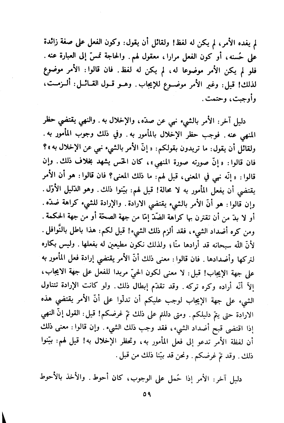 دَلِيل آخر الْأَمر بالشَّيْء نهي عَن صده والإخلال بِهِ وَالنَّهْي يَقْتَضِي حظر الْمنْهِي عَنهُ فَوَجَبَ حظر الْإِخْلَال بالمأمور بِهِ وَفِي ذَلِك وجوب الْمَأْمُور بِهِ وَلقَائِل أَن يَقُول مَا تُرِيدُونَ بقولكم إِن الْأَمر بالشَّيْء نهي عَن الْإِخْلَال بِهِ فان قَالُوا إِن صورته صُورَة الْمنْهِي كَانَ الْحس يشْهد بِخِلَاف ذَلِك وَإِن قَالُوا إِنَّه نهي فِي الْمَعْنى قيل لَهُم مَا ذَلِك الْمَعْنى فان قَالُوا هُوَ أَن الْأَمر يَقْتَضِي أَن يفعل الْمَأْمُور بِهِ لَا محَالة قيل لَهُم بينوا ذَلِك وَهُوَ الدَّلِيل الأول وَإِن قَالُوا هُوَ أَن الْأَمر بالشَّيْء يَقْتَضِي الْإِرَادَة والإرادة للشَّيْء كَرَاهَة ضِدّه أَو لَا بُد من أَن تقترن بهَا كَرَاهَة الضِّدّ إِمَّا من جِهَة الصِّحَّة أَو من جِهَة الْحِكْمَة وَمن كره أضداد الشَّيْء فقد ألزم ذَلِك الشَّيْء قيل لكم هَذَا بَاطِل بالنوافل لِأَن الله سُبْحَانَهُ قد أرادها منا وَلذَلِك نَكُون مُطِيعِينَ لَهُ بِفِعْلِهَا وَلَيْسَ بكاره لتركها واضدادها فان قَالُوا معنى ذَلِك أَن الْأَمر يَقْتَضِي إِرَادَة فعل الْمَأْمُور بِهِ على جِهَة الْإِيجَاب قيل لَا معنى لكَون الْحَيّ مرِيدا للْفِعْل على جِهَة الْإِيجَاب إِلَّا أَنه أَرَادَهُ وَكره تَركه وَقد تقدم إبِْطَال ذَلِك وَلَو كَانَت الْإِرَادَة تتَنَاوَل الشَّيْء على جِهَة الْإِيجَاب لوَجَبَ عَلَيْكُم أَن تدلوا على أَن الْأَمر يَقْتَضِي هَذِه الْإِرَادَة حَتَّى يتم دليلكم وَمَتى دللتم على ذَلِك تمّ غرضكم قيل القَوْل إِن النَّهْي إِذا اقْتضى قبح أضداد الشَّيْء فقد وَجب ذَلِك الشَّيْء وَإِن قَالُوا معنى ذَلِك أَن لَفْظَة الْأَمر تَدْعُو إِلَى فعل الْمَأْمُور بِهِ وتحظر الْإِخْلَال بِهِ قيل لَهُم بينوا ذَلِك وَقد تمّ غرضكم وَنحن قد بَينا ذَلِك من قبل