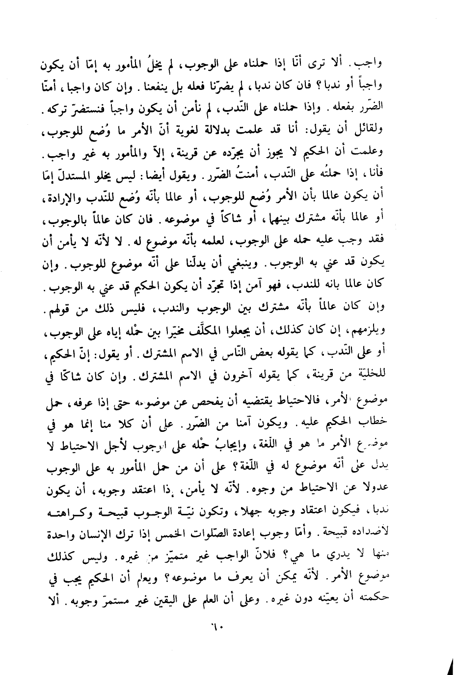 وَاجِب أَلا ترى أَنا إِذا حملناه على الْوُجُوب لم يخل الْمَأْمُور بِهِ إِمَّا أَن يكون وَاجِبا أَو ندبا فان كَانَ ندبا لم يضرنا فعله بل ينفعنا وَإِن كَانَ وَاجِبا أمنا الضَّرَر بِفِعْلِهِ وَإِذا حملناه على النّدب لم نَأْمَن أَن يكون وَاجِبا فنستضر تَركه وَلقَائِل أَن يَقُول أَنا قد علمت بِدلَالَة لغوية أَن الْأَمر مَا وضع للْوُجُوب وَعلمت أَن الْحَكِيم لَا يجوز أَن يجرده عَن قرينَة إِلَّا والمأمور بِهِ غير وَاجِب فَأَنا إِذا حَملته على النّدب أمنت الضَّرَر وَيَقُول أَيْضا لَيْسَ يَخْلُو الْمُسْتَدلّ إِمَّا أَن يكون عَالما بِأَن الْأَمر وضع للْوُجُوب أَو عَالما بِأَنَّهُ وضع للنَّدْب والإرادة أَو عَالما بِأَنَّهُ مُشْتَرك بَينهمَا أَو شاكا فِي مَوْضُوعه فان كَانَ عَالما بِالْوُجُوب فقد وَجب عَلَيْهِ حمله على الْوُجُوب لعلمه بِأَنَّهُ مَوْضُوع لَهُ لَا لِأَنَّهُ لَا يَأْمَن أَن يكون قد عني بِهِ الْوُجُوب وَيَنْبَغِي أَن يدلنا على أَنه مَوْضُوع للْوُجُوب وَإِن كَانَ عَالما بانه للنَّدْب فَهُوَ آمن إِذا تجرد أَن يكون الْحَكِيم قد عني بِهِ الْوُجُوب وَإِن كَانَ عَالما بِأَنَّهُ مُشْتَرك بَين الْوُجُوب وَالنَّدْب فَلَيْسَ ذَلِك من قَوْلهم ويلزمهم إِن كَانَ كَذَلِك أَن يجْعَلُوا الْمُكَلف مُخَيّرا بَين حمله إِيَّاه على الْوُجُوب أَو على النّدب كَمَا يَقُوله بعض النَّاس فِي الِاسْم الْمُشْتَرك أَو يَقُول إِن الْحَكِيم للخلية من قرينَة كَمَا يَقُوله آخَرُونَ فِي الِاسْم الْمُشْتَرك وَأَن كَانَ شاكا فِي مَوْضُوع الْأَمر فالاحتياط يَقْتَضِيهِ أَن يفحص عَن مَوْضُوعه حَتَّى إِذا عرفه حمل خطاب الْحَكِيم عَلَيْهِ وَيكون آمنا من الضَّرَر على أَن كلا منا إِنَّمَا هُوَ فِي مَوْضُوع الْأَمر مَا هُوَ فِي اللُّغَة وَإِيجَاب حمله على الْوُجُوب لأجل الِاحْتِيَاط لَا يدل على أَنه مَوْضُوع لَهُ فِي اللُّغَة على أَن من حمل الْمَأْمُور بِهِ على الْوُجُوب عُدُولًا عَن الِاحْتِيَاط من وُجُوه لِأَنَّهُ لَا يَأْمَن إِذا اعْتقد وُجُوبه أَن يكون ندبا فَيكون اعْتِقَاد وُجُوبه جهلا وَتَكون نِيَّة الْوُجُوب قبيحة وكراهته لأضداده قبيحة وَأما وجوب إِعَادَة الصَّلَوَات الْخمس إِذا ترك الْإِنْسَان وَاحِدَة مِنْهَا لَا يدْرِي مَا هِيَ فلَان الْوَاجِب غير متميز من غَيره وَلَيْسَ كَذَلِك مَوْضُوع الْأَمر لِأَنَّهُ يُمكن أَن يعرف مَا مَوْضُوعه وَيعلم أَن الْحَكِيم يجب فِي حكمته أَن يُعينهُ دون غَيره وعَلى أَن الْعلم على الْيَقِين غير مُسْتَمر وُجُوبه أَلا