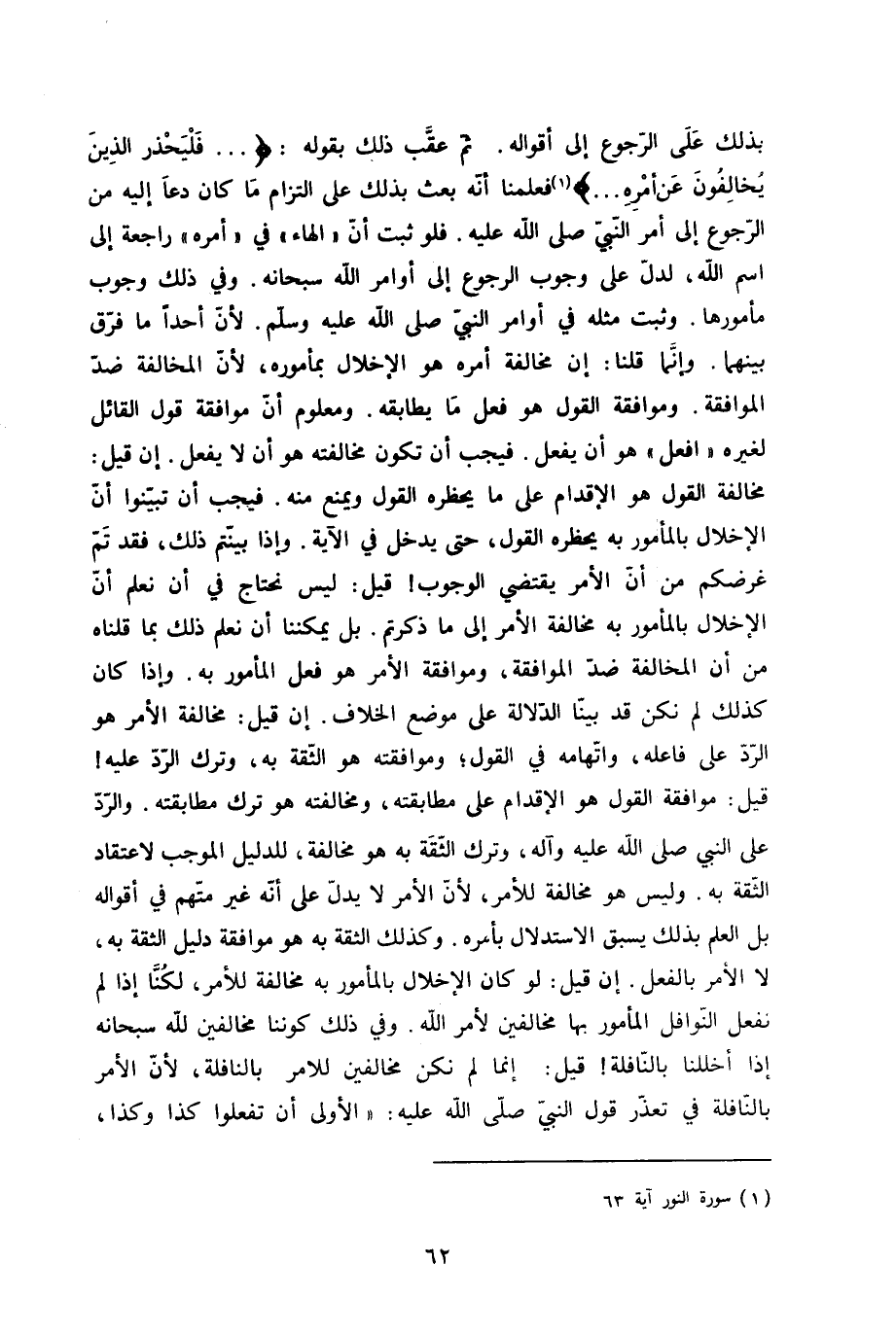بذلك على الرُّجُوع إِلَى أَقْوَاله ثمَّ عقب ذَلِك بقوله {فليحذر الَّذين يخالفون عَن أمره} فَعلمنَا أَنه بعث بذلك على الْتِزَام مَا كَانَ دَعَا إِلَيْهِ من الرُّجُوع إِلَى أَمر النَّبِي صلى الله عَلَيْهِ وَسلم فَلَو ثَبت أَن الْهَاء فِي أمره رَاجِعَة إِلَى اسْم الله لدل على وجوب الرُّجُوع إِلَى أوَامِر الله سُبْحَانَهُ وَفِي ذَلِك وجوب مأمورها وَثَبت مثله فِي أوَامِر النَّبِي صلى الله عَلَيْهِ وَسلم لِأَن أحدا مَا فرق بَينهمَا وَإِنَّمَا قُلْنَا إِن مُخَالفَة أمره هُوَ الْإِخْلَال بمأموره لِأَن الْمُخَالفَة ضد الْمُوَافقَة وموافقة القَوْل هُوَ فعل مَا يطابقه وَمَعْلُوم أَن مُوَافقَة قَول الْقَائِل لغيره افْعَل هُوَ أَن يفعل فَيجب أَن تكون مُخَالفَته هُوَ أَن لَا يفعل إِن قيل مُخَالفَة القَوْل هُوَ الْإِقْدَام على مَا يحظره القَوْل وَيمْنَع مِنْهُ فَيجب أَن تبينوا أَن الْإِخْلَال بالمأمور بِهِ يحظره القَوْل حَتَّى يدْخل فِي الاية وَإِذا بينتم ذَلِك فقد تمّ غرضكم من أَن الْأَمر يَقْتَضِي الْوُجُوب قيل لَيْسَ نحتاج فِي أَن نعلم أَن الْإِخْلَال بالمأمور بِهِ مُخَالفَة الْأَمر إِلَى مَا ذكرْتُمْ بل يمكننا أَن نعلم ذَلِك بِمَا قُلْنَاهُ من أَن الْمُخَالفَة ضد الْمُوَافقَة وموافقة الْأَمر هُوَ فعل الْمَأْمُور بِهِ وَإِذا كَانَ كَذَلِك لم نَكُنْ قد بَينا الدّلَالَة على مَوضِع الْخلاف إِن قيل مُخَالفَة الْأَمر هُوَ الرَّد على فَاعله واتهامه فِي القَوْل وموافقته هُوَ الثِّقَة بِهِ وَترك الرَّد عَلَيْهِ قيل مُوَافقَة القَوْل هُوَ الْإِقْدَام على مطابقته ومخالفته هُوَ ترك مطابقته وَالرَّدّ على النَّبِي صلى الله عَلَيْهِ وَسلم وأله وَترك الثِّقَة بِهِ هُوَ مُخَالفَة للدليل الْمُوجب لاعتقاد الثِّقَة بِهِ وَلَيْسَ هُوَ مُخَالفَة لِلْأَمْرِ لِأَن الْأَمر لَا يدل على أَنه غير مُتَّهم فِي أَقْوَاله بل الْعلم بذلك يسْبق الِاسْتِدْلَال بأَمْره وَكَذَلِكَ الثِّقَة بِهِ هُوَ مُوَافقَة دَلِيل الثِّقَة بِهِ لَا الْأَمر بِالْفِعْلِ إِن قيل لَو كَانَ الْإِخْلَال بالمأمور بِهِ مُخَالفَة لِلْأَمْرِ لَكنا إِذا لم نَفْعل النَّوَافِل الْمَأْمُور بهَا مخالفين لأمر الله وَفِي ذَلِك كوننا مخالفين لله سُبْحَانَهُ إِذا أخللنا بالنافلة قيل إِنَّمَا لم نَكُنْ مخالفين للامر بالنافلة لِأَن الْأَمر بالنافلة فِي تعذر قَول النَّبِي صلى الله عَلَيْهِ وَسلم الأولى أَن تَفعلُوا كَذَا وَكَذَا