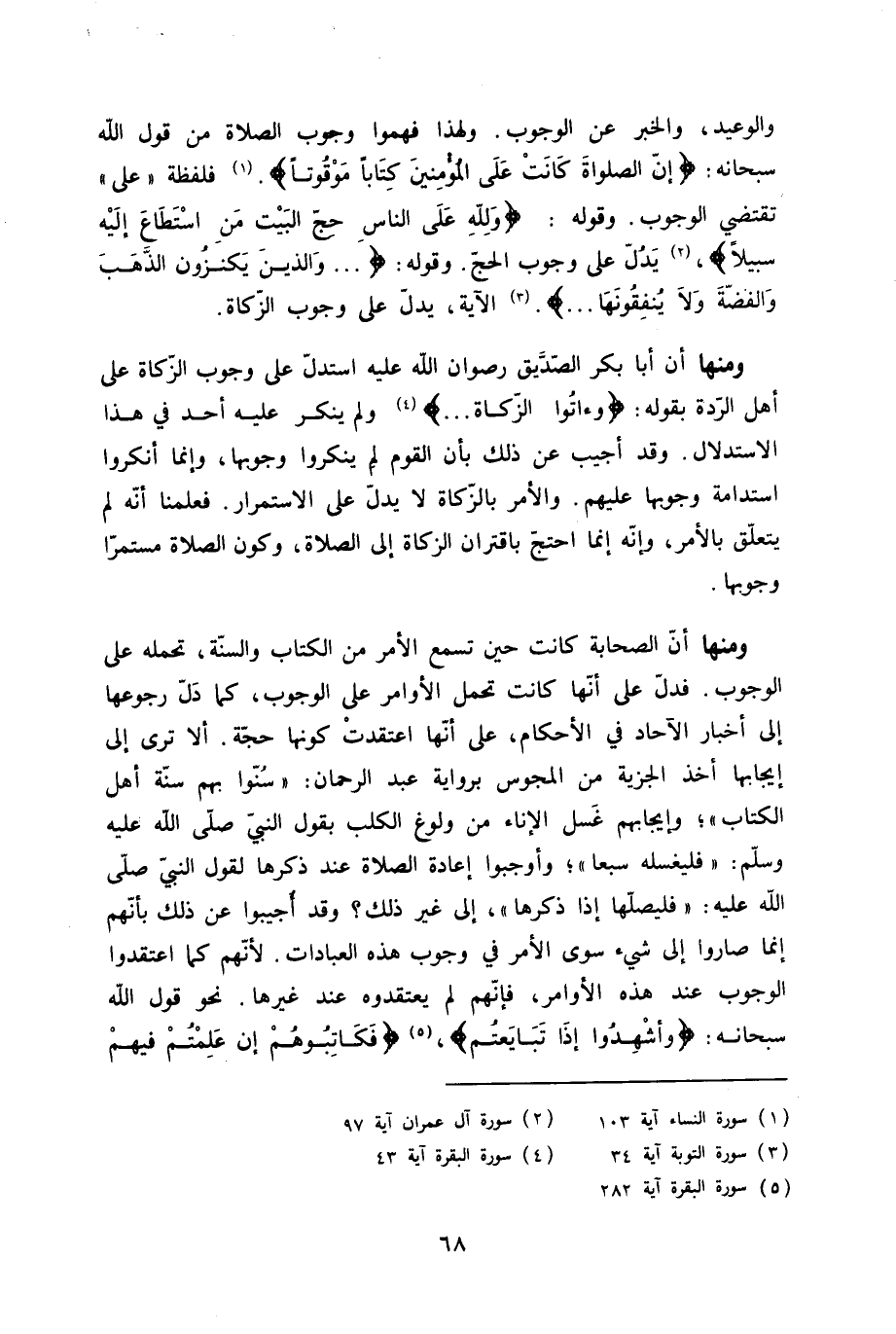 وَمِنْهَا أَن أَبَا بكر الصّديق رضوَان الله عَلَيْهِ اسْتدلَّ على وجوب الزَّكَاة على أهل الرِّدَّة بقوله {وَآتوا الزَّكَاة} وَلم يُنكر عَلَيْهِ أحد فِي هَذَا الِاسْتِدْلَال وَقد أُجِيب عَن ذَلِك بِأَن الْقَوْم لم ينكروا وُجُوبهَا وَإِنَّمَا أَنْكَرُوا اسْتِدَامَة وُجُوبهَا عَلَيْهِم وَالْأَمر بِالزَّكَاةِ لَا يدل على الِاسْتِمْرَار فَعلمنَا أَنه لم يتَعَلَّق بِالْأَمر وَإنَّهُ إِنَّمَا احْتج باقتران الزَّكَاة إِلَى الصَّلَاة وَكَون الصَّلَاة مستمرا وُجُوبهَا