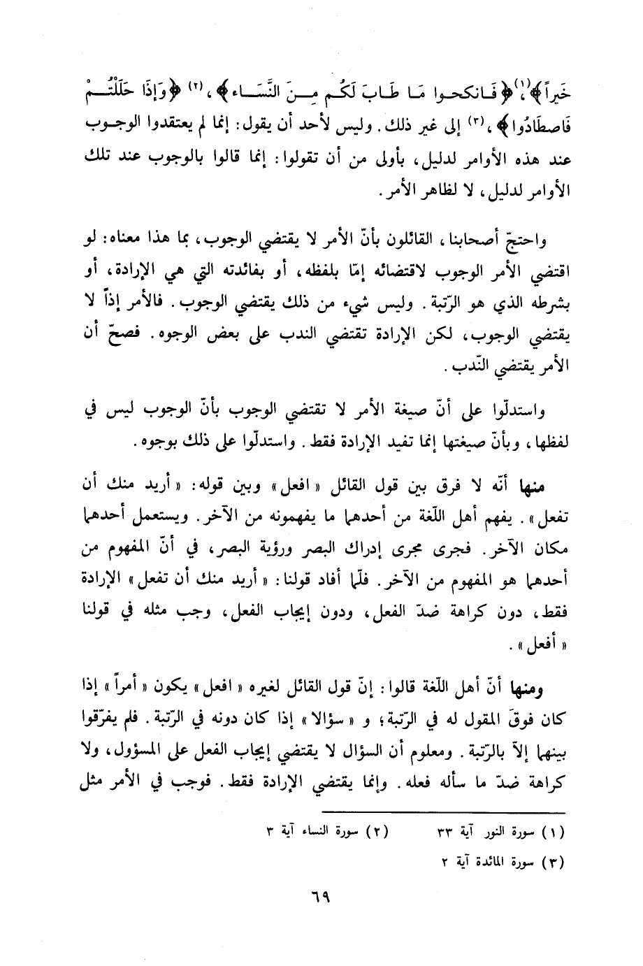 مِنْهَا أَنه لَا فرق بَين قَول الْقَائِل افْعَل وَبَين قَوْله أُرِيد مِنْك أَن تفعل يفهم أهل اللُّغَة من أَحدهمَا مَا يفهمونه من الآخر وَيسْتَعْمل أَحدهمَا مَكَان الآخر فَجرى مجْرى إِدْرَاك الْبَصَر ورؤية الْبَصَر فِي أَن الْمَفْهُوم من أَحدهمَا هُوَ الْمَفْهُوم الآخر فَلَمَّا أَفَادَ قَوْلنَا أُرِيد مِنْك أَن تفعل الْإِرَادَة فَقَط دون كَرَاهَة ضد الْفِعْل وَدون إِيجَاب الْفِعْل وَجب مثله فِي قَوْلنَا أفعل