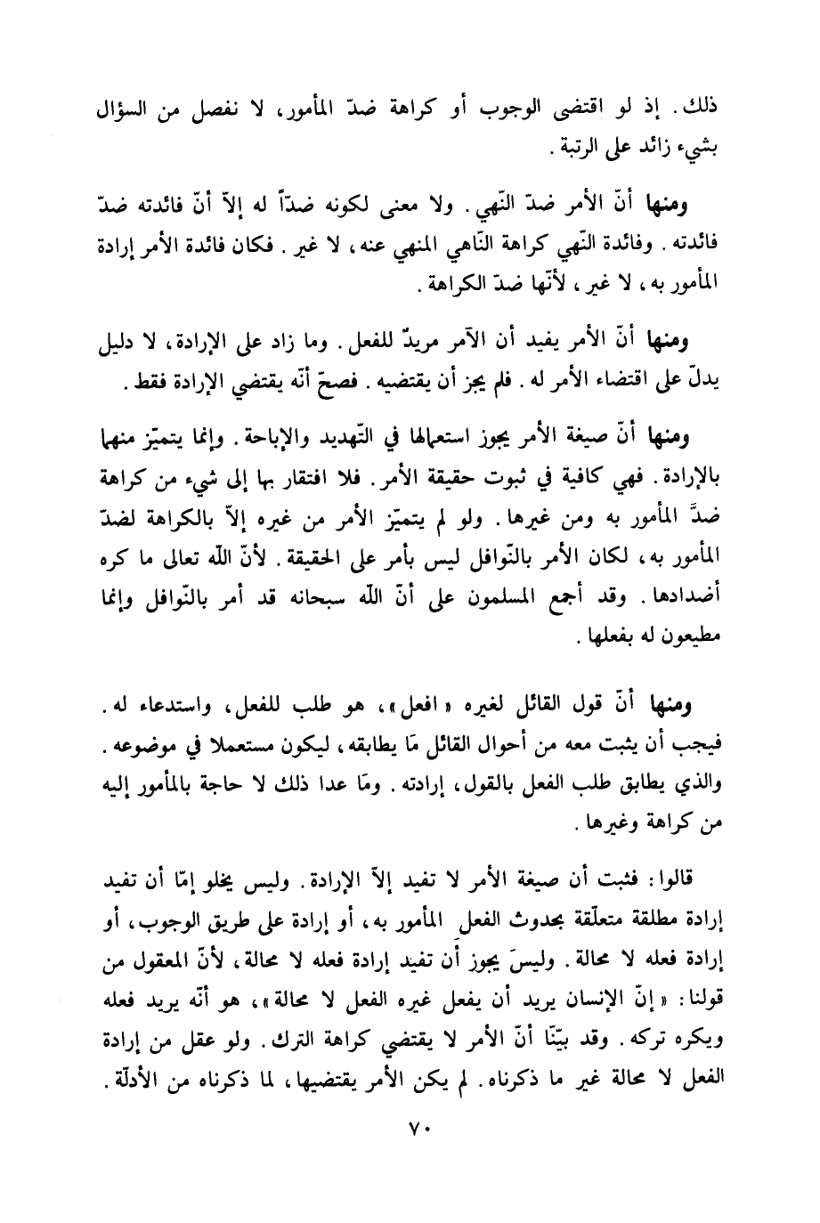 وَمِنْهَا أَن قَول الْقَائِل لغيره افْعَل هُوَ طلب للْفِعْل واستدعاء لَهُ فَيجب أَن يثبت مَعَه من أَحْوَال الْقَائِل مَا يطابقه ليَكُون مُسْتَعْملا فِي مَوْضُوعه وَالَّذِي يُطَابق طلب الْفِعْل بالْقَوْل إِرَادَته وَمَا عدا ذَلِك لَا حَاجَة بالمأمور إِلَيْهِ من كَرَاهَة وَغَيرهَا
