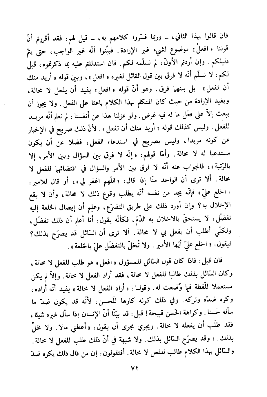 فان قيل فاذا كَانَ قَول السَّائِل للمسؤول افْعَل هُوَ طلب للْفِعْل لَا محَالة وَكَانَ السَّائِل بذلك طَالبا للْفِعْل لَا محَالة فقد أَرَادَ الْفِعْل لَا محَالة وَإِلَّا لم يكن مُسْتَعْملا للفظة فِيمَا وضعت لَهُ وَقَوْلنَا أَرَادَ الْفِعْل لَا محَالة يُفِيد أَنه أَرَادَهُ وَكره ضِدّه وَتَركه وَفِي ذَلِك كَونه كَارِهًا لِلْحسنِ لِأَنَّهُ قد يكون ضد مَا سَأَلَهُ حسنا وَكَرَاهَة الْحسن قبيحة قيل قد بَينا أَن الْإِنْسَان إِذا سَأَلَ غَيره شَيْئا فقد طلب أَن يَفْعَله لَا محَالة وَيجْرِي مجْرى أَن يَقُول أَعْطِنِي مَالا وَلَا تخل بذلك وَقد يُصَرح السَّائِل بذلك وَلَا شُبْهَة فِي أَن ذَلِك طلب للْفِعْل لَا محَالة والسائل بِهَذَا الْكَلَام طَالب للْفِعْل لَا محَالة أفتقولون إِن من قَالَ ذَلِك يكره ضد