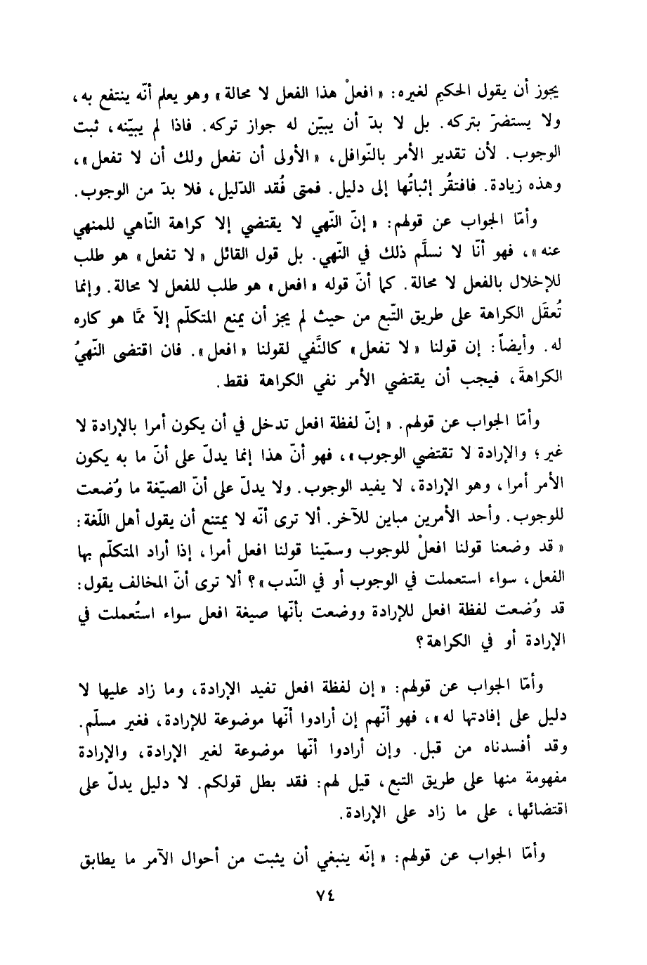 وَأما الْجَواب عَن قَوْلهم إِن لَفْظَة افْعَل تدخل فِي أَن يكون أمرا بالإرادة لَا غير والإرادة لَا تَقْتَضِي الْوُجُوب فَهُوَ أَن هَذَا إِنَّمَا يدل على أَن مَا بِهِ يكون الْأَمر أمرا وَهُوَ الْإِرَادَة لَا يُفِيد الْوُجُوب وَلَا يدل على أَن الصِّيغَة مَا وضعت للْوُجُوب وَأحد الْأَمريْنِ مباين للْآخر أَلا ترى أَنه لَا يمْتَنع أَن يَقُول أهل اللُّغَة قد وَضعنَا قَوْلنَا افْعَل للْوُجُوب وسمينا قَوْلنَا افْعَل أمرا إِذا أَرَادَ الْمُتَكَلّم بهَا الْفِعْل سَوَاء اسْتعْملت فِي الْوُجُوب أَو فِي النّدب أَلا ترى أَن الْمُخَالف يَقُول قد وضعت لَفْظَة افْعَل للإرادة وَوضعت بِأَنَّهَا صِيغَة افْعَل سَوَاء اسْتعْملت فِي الْإِرَادَة أَو فِي الْكَرَاهَة