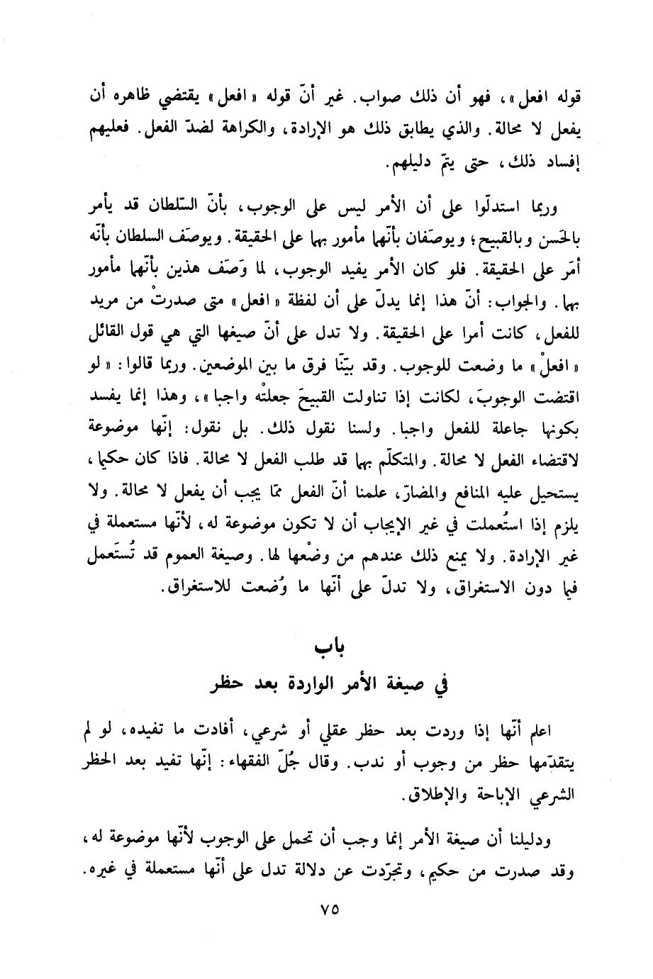 وَرُبمَا استدلوا على أَن الْأَمر لَيْسَ على الْوُجُوب بِأَن السُّلْطَان قد يَأْمر بالْحسنِ وبالقبيح ويوصفان بِأَنَّهُمَا مَأْمُور بهما على الْحَقِيقَة ويوصف السُّلْطَان بِأَنَّهُ أَمر على الْحَقِيقَة فَلَو كَانَ الْأَمر يُفِيد الْوُجُوب لما وصف هذَيْن بِأَنَّهُمَا مَأْمُور بهما وَالْجَوَاب أَن هَذَا إِنَّمَا يدل على أَن لَفْظَة افْعَل مَتى صدرت من مُرِيد للْفِعْل كَانَت أمرا على الْحَقِيقَة وَلَا تدل على أَن صيغها الَّتِي هِيَ قَول الْقَائِل افْعَل مَا وضعت للْوُجُوب وَقد بَينا فرق مَا بَين الْمَوْضِعَيْنِ وَرُبمَا قَالُوا لَو اقْتَضَت الْوُجُوب لكَانَتْ إِذا تناولت الْقَبِيح جعلته وَاجِبا وَهَذَا إِنَّمَا يفْسد بِكَوْنِهَا جاعلة للْفِعْل وَاجِبا ولسنا نقُول ذَلِك بل نقُول إِنَّهَا مَوْضُوعَة لاقْتِضَاء الْفِعْل لَا محَالة والمتكلم بهما قد طلب الْفِعْل لَا محَالة فاذا كَانَ حكيما يَسْتَحِيل عَلَيْهِ الْمَنَافِع والمضار علمنَا أَن الْفِعْل مِمَّا يجب أَن يفعل لَا محَالة وَلَا يلْزم إِذا اسْتعْملت فِي غير الْإِيجَاب أَن لَا تكون مَوْضُوعَة لَهُ لِأَنَّهَا مستعملة فِي غير الْإِرَادَة وَلَا يمْنَع ذَلِك عِنْدهم من وَضعهَا لَهَا وَصِيغَة الْعُمُوم قد تسْتَعْمل فِيمَا دون الِاسْتِغْرَاق وَلَا تدل على أَنَّهَا مَا وضعت للاستغراق - صَلَّى اللَّهُ عَلَيْهِ وَسَلَّم َ - بَاب فِي صِيغَة الْأَمر الْوَارِدَة بعد حظر - صَلَّى اللَّهُ عَلَيْهِ وَسَلَّم َ -
