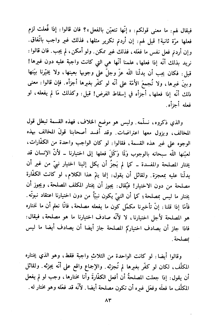 وَالَّذِي وَالَّذِي ذَكرُوهُ نسلمه وَلَيْسَ هُوَ مَوضِع الْخلاف فَهَذِهِ الْقِسْمَة تبطل قَول الْمُخَالف وَيَزُول مَعهَا اعتراضات وَقد أفسد أَصْحَابنَا قَول الْمُخَالف بِهَذِهِ على الْوُجُوه غير هَذِه الْقِسْمَة فَقَالُوا لَو كَانَ الْوَاجِب وَاحِدَة من الْكَفَّارَات لعينها الله سُبْحَانَهُ بِالْوُجُوب وَلما وكل فعلهَا إِلَى اختيارنا لِأَن الْإِنْسَان قد يخْتَار الْمصلحَة والمفسدة كَمَا لم يجز أَن يكل إِلَيْنَا اخْتِيَار نَبِي من غير أَن يدلنا عَلَيْهِ بمعجزة وَلقَائِل أَن يَقُول إِنَّمَا يتم هَذَا الْكَلَام لَو كَانَت الْكَفَّارَة مصلحَة من دون الِاخْتِيَار فَيُقَال يجوز أَن يخْتَار الْمُكَلف الْمصلحَة وَيجوز أَن يخْتَار مَا لَيْسَ بمصلحة كَمَا أَن النَّبِي يكون نَبيا من دون اختيارنا اعْتِقَاد نبوته فَأَما إِذا قُلْنَا إِن تأخيرنا مكمل كَون مَا يَفْعَله مصلحَة فَإنَّا نعلم أَن مَا نختاره هُوَ الْمصلحَة لأجل اختيارنا لَا لِأَنَّهُ صَادف اختيارنا مَا هُوَ مصلحَة فَيُقَال فاذا جَازَ أَن يُصَادف اختياركم الْمصلحَة جَازَ أَيْضا أَن يُصَادف أَيْضا مَا لَيْسَ بمصلحة