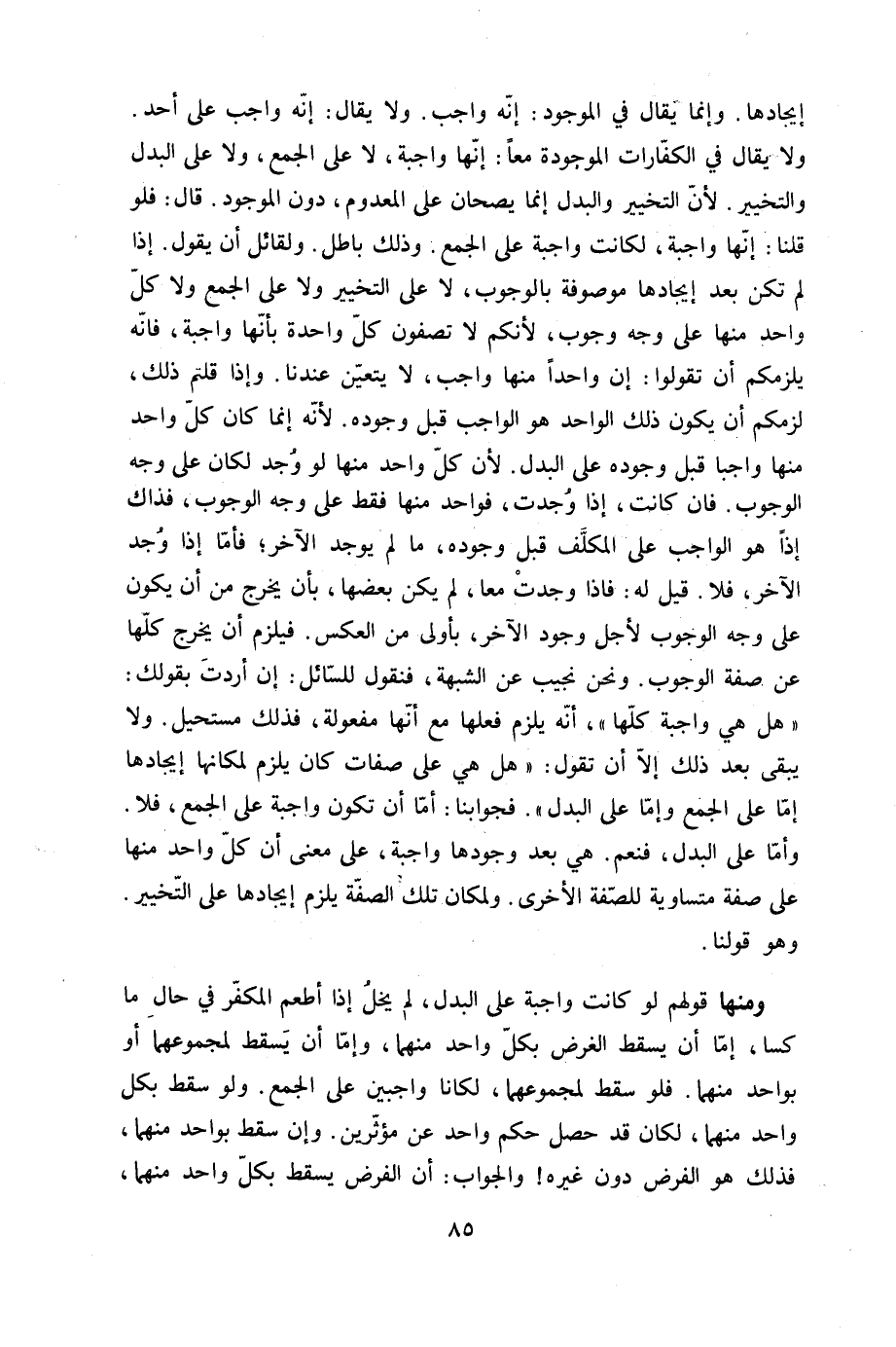 إيجادها وَإِنَّمَا يُقَال فِي الْمَوْجُود إِنَّه وَاجِب وَلَا يُقَال إِنَّه وَاجِب على أحد وَلَا يُقَال فِي الْكَفَّارَات الْمَوْجُودَة مَعًا إِنَّهَا وَاجِبَة لَا على الْجمع وَلَا على الْبَدَل والتخيير لِأَن التَّخْيِير وَالْبدل إِنَّمَا يصحان على الْمَعْدُوم دون الْمَوْجُود قَالَ فَلَو قُلْنَا إِنَّهَا وَاجِبَة لكَانَتْ وَاجِبَة على الْجمع وَذَلِكَ بَاطِل وَلقَائِل أَن يَقُول إِذا لم تكن بعد إيجادها مَوْصُوفَة بِالْوُجُوب لَا على التَّخْيِير وَلَا على الْجمع وَلَا كل وَاحِد مِنْهَا على وَجه وجوب لأنكم لَا تصفون كل وَاحِدَة بِأَنَّهَا وَاجِبَة فانه يلزمكم أَن تَقولُوا إِن وَاحِد مِنْهَا وَاجِب لَا يتَعَيَّن عندنَا وَإِذا قُلْتُمْ ذَلِك لزمكم أَن يكون ذَلِك الْوَاحِد هُوَ الْوَاجِب قبل وجوده لِأَنَّهُ إِنَّمَا كَانَ كل وَاحِد مِنْهَا وَاجِبا قبل وجوده على الْبَدَل لِأَن كل وَاحِد مِنْهَا لَو وجد لَكَانَ على وَجه الْوُجُوب فان كَانَت إِذا وجدت فواحد مِنْهَا فَقَط على وَجه الْوُجُوب فَذَاك إِذا هُوَ الْوَاجِب على الْمُكَلف قبل وجوده مَا لم يُوجد الآخر فَأَما إِذا وجد الآخر فَلَا قيل لَهُ فاذا وجدت مَعًا لم يكن بَعْضهَا بِأَن يخرج من أَن يكون على وَجه الْوُجُوب لأجل وجود الآخر بِأولى من الْعَكْس فَيلْزم أَن يخرج كلهَا عَن صفة الْوُجُوب وَنحن نجيب عَن الشُّبْهَة فَنَقُول للسَّائِل إِن أردْت بِقَوْلِك هَل هِيَ وَاجِبَة كلهَا انه يلْزم فعلهَا مَعَ أَنَّهَا مفعولة فَذَلِك مُسْتَحِيل وَلَا يبْقى بعد ذَلِك إِلَّا أَن تَقول هَل هِيَ على صِفَات كَانَ يلْزم لمكانها إيجادها إِمَّا على الْجمع وَإِمَّا على الْبَدَل فجوابنا أما أَن تكون وَاجِبَة على الْجمع فَلَا وَأما على الْبَدَل فَنعم هِيَ بعد وجودهَا وَاجِبَة على معنى أَن كل وَاحِد مِنْهَا على صفة مُتَسَاوِيَة للصفة الْأُخْرَى ولمكان تِلْكَ الصّفة يلْزم إيجادها على التَّخْيِير وَهُوَ قَوْلنَا