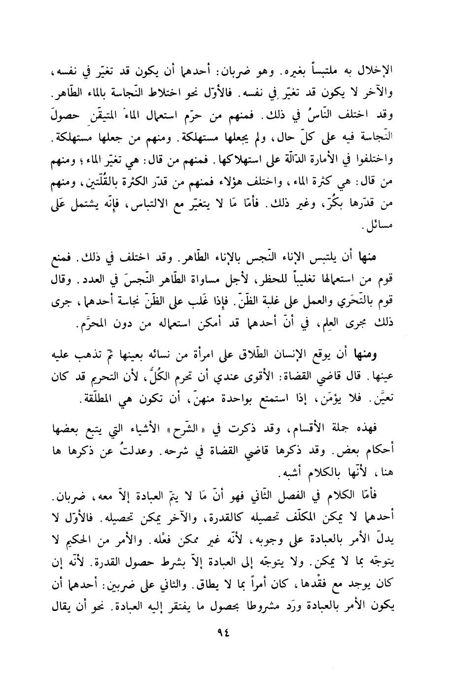 الْإِخْلَال بِهِ ملتبسا بِغَيْرِهِ وَهُوَ ضَرْبَان أَحدهمَا أَن يكون قد تغير فِي نَفسه وَالْآخر لَا يكون قد تغير فِي نَفسه فَالْأول نَحْو اخْتِلَاط النَّجَاسَة بِالْمَاءِ الطَّاهِر وَقد اخْتلف النَّاس فِي ذَلِك فَمنهمْ من حرم اسْتِعْمَال المَاء الْمُتَيَقن حُصُول النَّجَاسَة فِيهِ على كل حَال وَلم يَجْعَلهَا مستهلكة وَمِنْهُم من جعلهَا مستهلكة وَاخْتلفُوا فِي الأمارة الدَّالَّة على استهلاكها فَمنهمْ من قَالَ هِيَ تغير المَاء وَمِنْهُم من قَالَ هِيَ كَثْرَة المَاء وَاخْتلف هَؤُلَاءِ فَمنهمْ من قدر الْكَثْرَة بالقلتين وَمِنْهُم من قدرهَا بكر وَغير ذَلِك فَأَما مَا لَا يتَغَيَّر مَعَ الالتباس فَإِنَّهُ يشْتَمل على مسَائِل