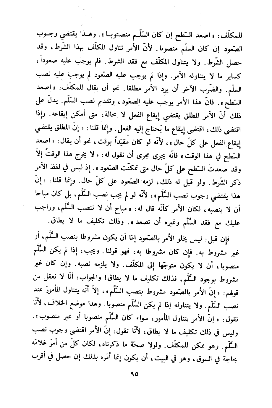 للمكلف اصْعَدْ السَّطْح إِن كَانَ السّلم مَنْصُوبًا وَهَذَا يَقْتَضِي وجوب الصعُود إِن كَانَ السّلم مَنْصُوبًا لِأَن الْأَمر تنَاول الْمُكَلف بِهَذَا الشَّرْط وَقد حصل الشَّرْط وَلَا يتَنَاوَل الْمُكَلف مَعَ فقد الشَّرْط فَلم يُوجب عَلَيْهِ صعُودًا كساير مَا لَا يتَنَاوَلهُ الْأَمر وَإِذا لم يُوجب عَلَيْهِ الصعُود لم يُوجب عَلَيْهِ نصب السّلم وَالضَّرْب الآخر أَن يرد الْأَمر مُطلقًا نَحْو أَن يُقَال للمكلف اصْعَدْ السَّطْح فان هَذَا الْأَمر يُوجب عَلَيْهِ الصعُود وَتَقْدِيم نصب السّلم يدل على ذَلِك أَن الْأَمر الْمُطلق يَقْتَضِي إِيقَاع الْفِعْل لَا محَالة مَتى أمكن إِيقَاعه وَإِذا اقْتضى ذَلِك اقْتضى إِيقَاع مَا يحْتَاج إِلَيْهِ الْفِعْل وَإِنَّمَا قُلْنَا إِن الْمُطلق يَقْتَضِي إِيقَاع الْفِعْل على كل حَال لِأَنَّهُ لَو كَانَ مُقَيّدا بِوَقْت نَحْو أَن يُقَال اصْعَدْ السَّطْح فِي هَذَا الْوَقْت فانه يجْرِي مجْرى أَن نقُول لَهُ لَا يخرج هَذَا الْوَقْت إِلَّا وَقد صعدت السَّطْح على كل حَال مَتى تمكنت الصعُود إِذْ لَيْسَ فِي لفظ الْأَمر ذكر الشَّرْط وَلَو قيل لَهُ ذَلِك لزمَه الصعُود على كل حَال وَإِنَّمَا قُلْنَا إِن هَذَا يَقْتَضِي وجوب نصب السّلم لِأَنَّهُ لَو لم يجب نصب السّلم بل كَانَ مُبَاحا أَن لَا ينصبه لَكَانَ الْأَمر كَأَنَّهُ قَالَ لَهُ مُبَاح أَن لَا تنصب السّلم وواجب عَلَيْك مَعَ فقد السّلم وَغَيره أَن تصعد وَذَلِكَ تَكْلِيف مَا لَا يُطَاق