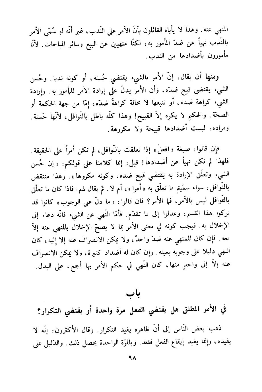 فَإِن قَالُوا صِيغَة افْعَل إِذا تعلّقت بالنوافل لم تكن أمرا على الْحَقِيقَة فَلهَذَا لم تكن نهيا عَن أضدادها قيل إِنَّمَا كلامنا على قَوْلكُم إِن حسن الشَّيْء وَتعلق الْإِرَادَة بِهِ يَقْتَضِي قبح ضِدّه وَكَونه مَكْرُوها وَهَذَا منتقض بالنوافل سَوَاء سميتم مَا تعلق بِهِ أمرا أم لَا ثمَّ يُقَال لَهُم فاذا كَانَ مَا تعلق بالنوافل لَيْسَ بِالْأَمر فَمَا الْأَمر فان قَالُوا مَا دلّ على الْوُجُوب كَانُوا قد تركُوا هَذَا الْقسم وَعدلُوا إِلَى مَا تقدم فَأَما النَّهْي عَن الشَّيْء فانه دُعَاء إِلَى الْإِخْلَال بِهِ فَيجب كَونه فِي معنى الْأَمر بِمَا لَا يَصح الْإِخْلَال بالمنهي عَنهُ إِلَّا مَعَه فَإِن كَانَ للمنهي عَنهُ ضد وَاحِد وَلَا يُمكن الِانْصِرَاف عَنهُ إِلَّا إِلَيْهِ كَانَ النَّهْي دَلِيلا على وُجُوبه بِعَيْنِه وَإِن كَانَ لَهُ اضداد كَثِيرَة وَلَا يُمكن الِانْصِرَاف عَنهُ إِلَّا إِلَى وَاحِد مِنْهَا كَانَ النَّهْي فِي حكم الْأَمر بهَا أجمع على الْبَدَل - صَلَّى اللَّهُ عَلَيْهِ وَسَلَّم َ - بَاب فِي الْأَمر الْمُطلق هَل يَقْتَضِي الْفِعْل مرّة وَاحِدَة أَو يَقْتَضِي التّكْرَار - صَلَّى اللَّهُ عَلَيْهِ وَسَلَّم َ -