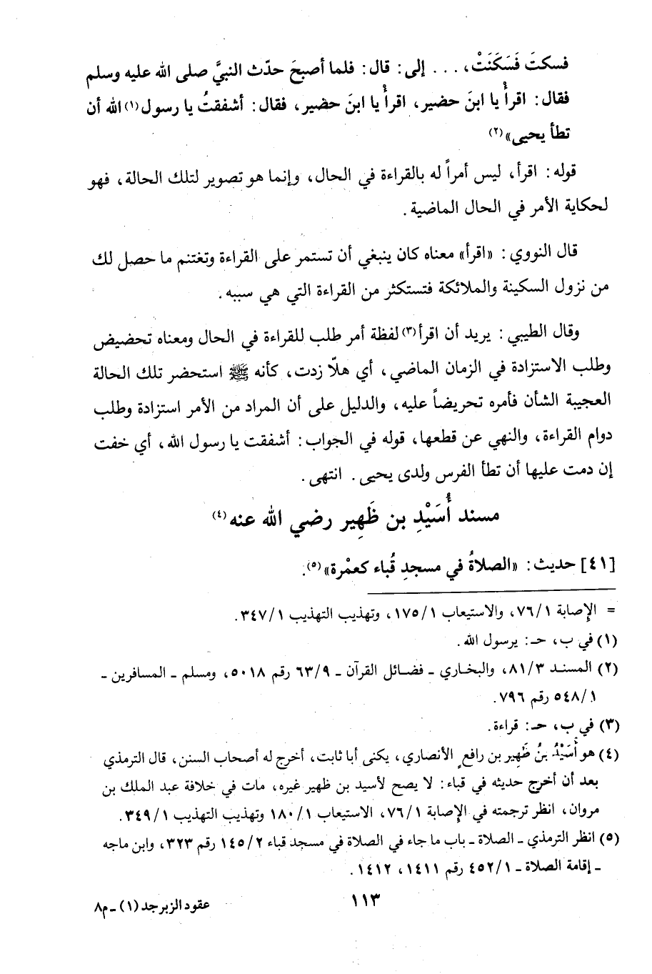 فسكتَ فسكَنتْ " إلى أن قال " فلمَّا أصبح حدَّثَ النبيَّ صلى الله عليه وسلم فقال: اقرا يا بْنَ حُضَير، اقرا يا بْنَ حُضَير. فقال: أشفقت يا رسولَ الله أن تَطأ يحي".