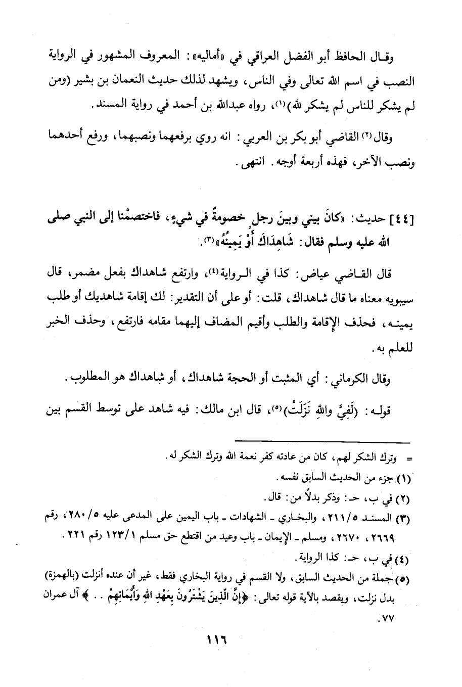 44 - حديث "كانَ بَيْني وبَين رَجُلٍ خُصومةٌ في شيء فاخْتَصَمْنا إلى النبيّ صلى الله عليه وسلم، فقال: شاهِداك أو يَمينه".