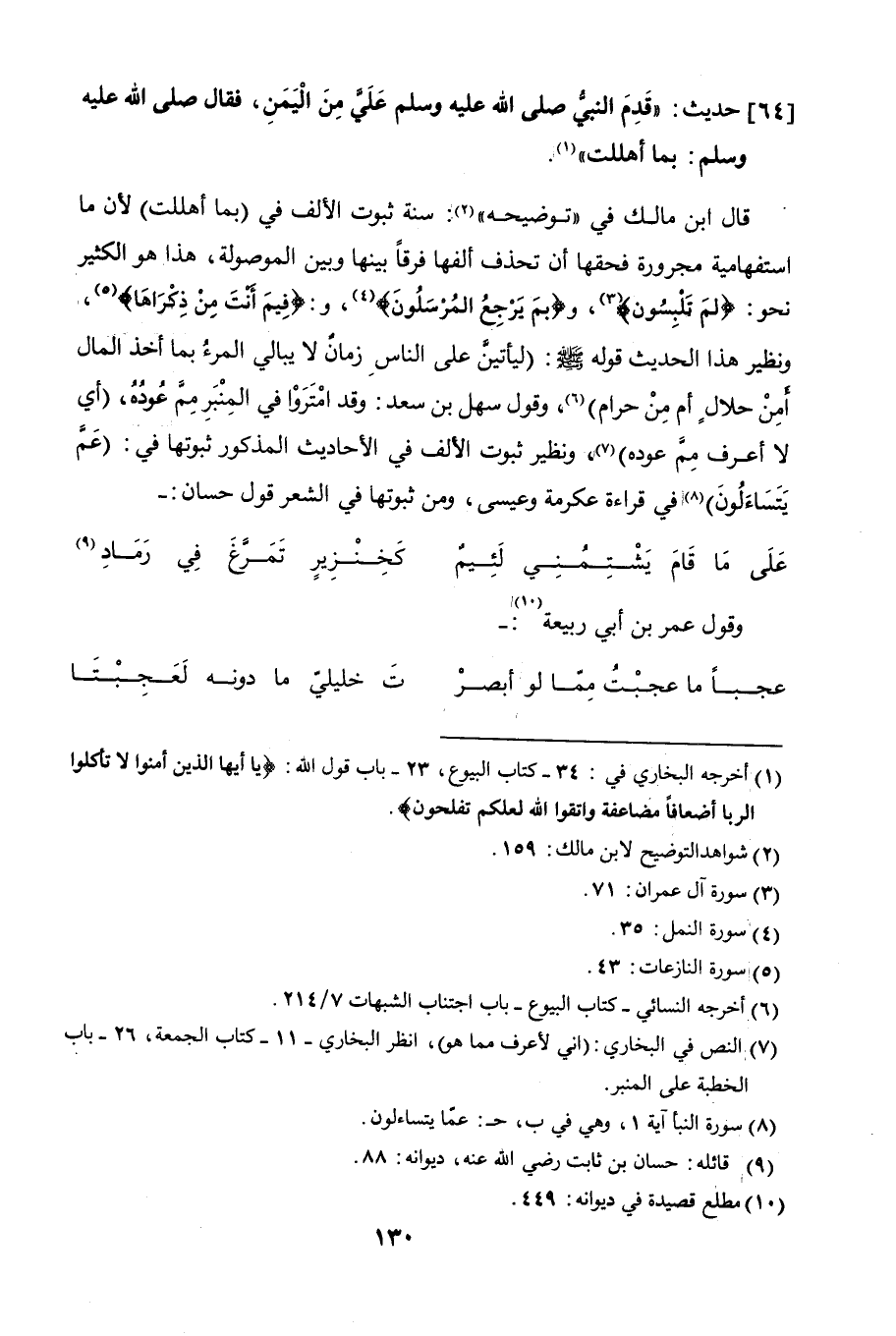 64 - حديث "قَدِمَ عَليٌّ على النبيِّ خيالها من اليمن، فقال: بِما أَهْلَلْتَ؟ ".