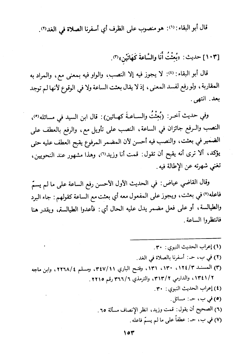 وقال القاضي عياض في الحديث الأول: "الأحسن رفع الساعة عطفاً على ما لم يسمّ فاعله في "بُعثتُ"، ويجوز النصب على المفعول معه، أي بعثت مع الساعة، كقولهم: جاء البردُ والطيالسةَ، أو على فعل مضمر يدلّ عليه الحال، أي فأعدّوا الطيالسة. ويقدّر هنا فانتظروا الساعة".