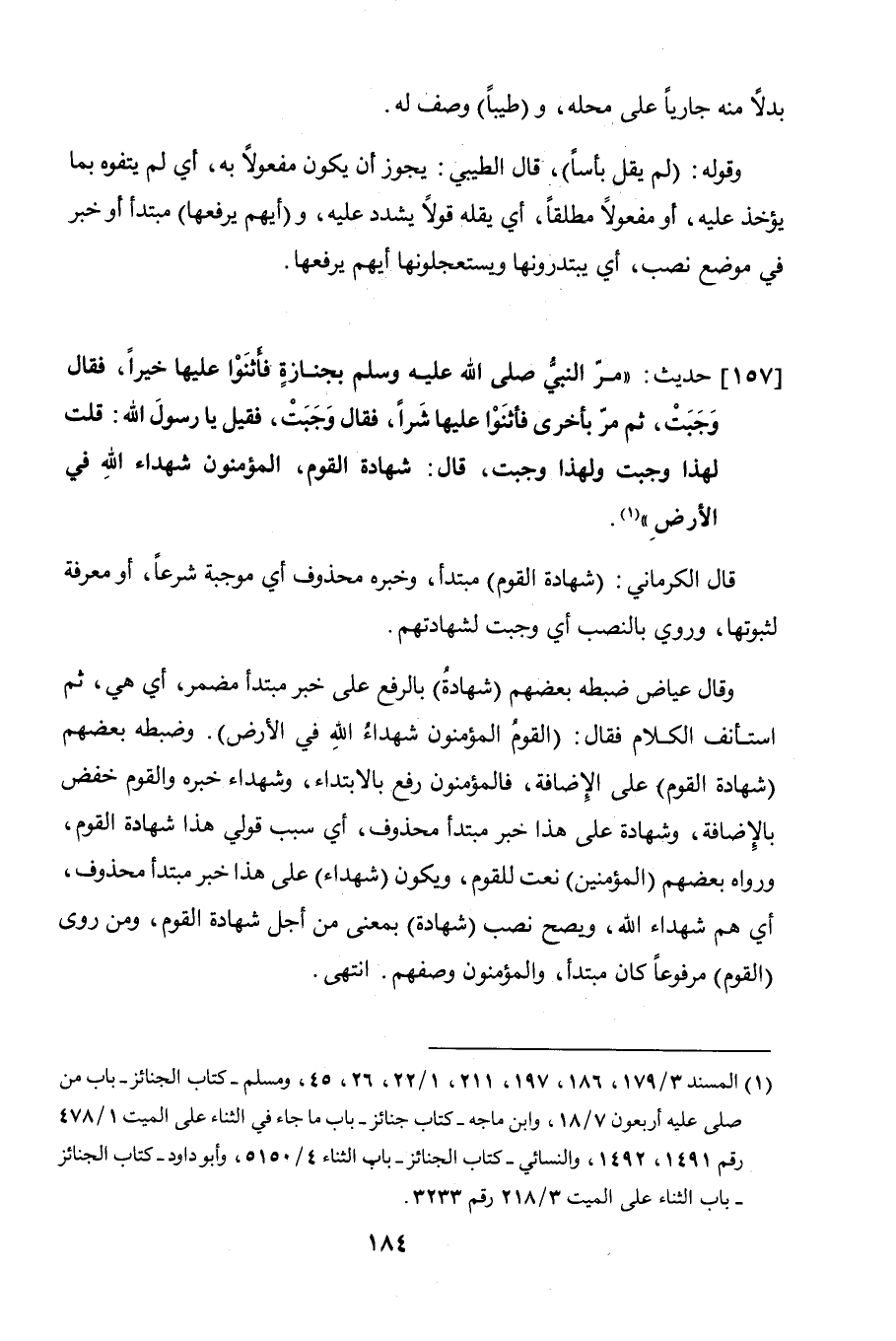 157 - حديث "مُرَّ على النبيّ صلى الله عليه وسلم بجنازة فأَثْنَوا عليها خيراً، فقال: وَجَبَتْ، ثم مُرَّ بأخرى فأثنوا عليها شراً، فقال: وجَبَتْ، فقيل: يا رسول الله، قلت لهذا وجَبَتْ ولهذا وجَبَتْ. قال: شهادةُ القوم، المؤمنون شُهداءُ الله في الأرض".