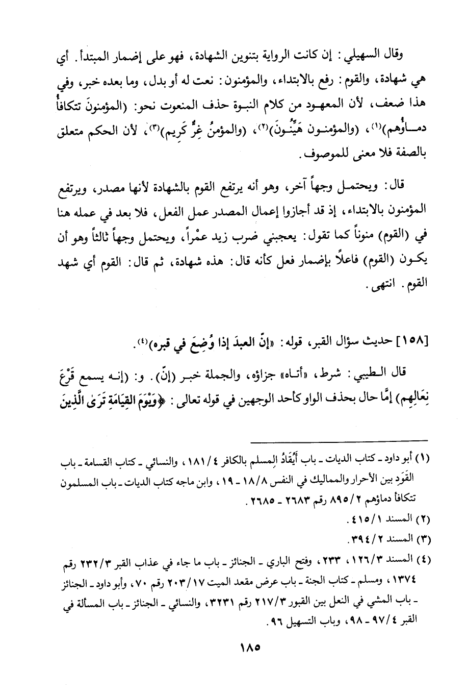 وقال السُهيلي: "إن كانت الرواية بتنوين الشهادة فهو على إضمار المبتدأ، أي هي شهادة، و"القوم" رفع بالابتداء، و"المؤمنون" نعت له أو بدل، وما بعده خبر. وفي هذا ضعف لأن المعهود من كلام النبوة حذف المنعوت نحو "المؤمنون تتكافأ دماؤهم" و"المؤمنون هينون لينون" و"المؤمنُ غِرٌّ كريم". لأن الحكم متعلّق بالصفة فلا معنى للموصوف".