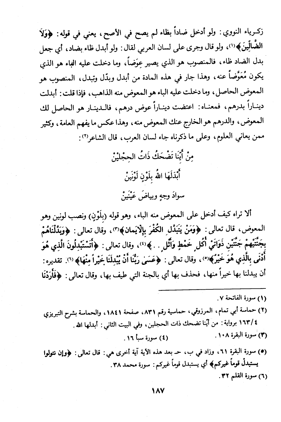 زكرياء النووي: "ولو أبدل ضادا بظاء لم يصحّ في الأصحّ". يعني في قوله: {وَلا الضَّالِّينَ} ولو جرى كلامه على اللسان العربي لقال: "ولو أبدل ظاء بضاد" أي جعل بدل الضاد ظاء، فالمنصوب هو الذي يصير عوضا، وما دخلت عليه الباء هو الذي يكون معوَّضاً منه.