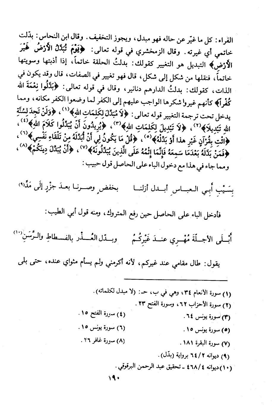 ومما يدخل تحت ترجمة التغيير قوله تعالى: {لا مُبَدِّلَ لِكَلِمَاتِهِ} {فَلَنْ تَجِدَ لِسُنَّتِ اللَّهِ تَبْدِيلاً} {لا تَبْدِيلَ لِكَلِمَاتِ اللَّهِ} {يُرِيدُونَ أَنْ يُبَدِّلُوا كَلامَ اللَّهِ} {ائْتِ بِقُرْآنٍ غَيْرِ هَذَا أَوْ بَدِّلْهُ قُلْ مَا يَكُونُ لِي أَنْ أُبَدِّلَهُ مِنْ تِلْقَاءِ نَفْسِي} {فَمَنْ بَدَّلَهُ بَعْدَ مَا سَمِعَهُ فَإِنَّمَا إِثْمُهُ عَلَى الَّذِينَ يُبَدِّلُونَهُ} {أَنْ يُبَدِّلَ دِينَكُمْ}.