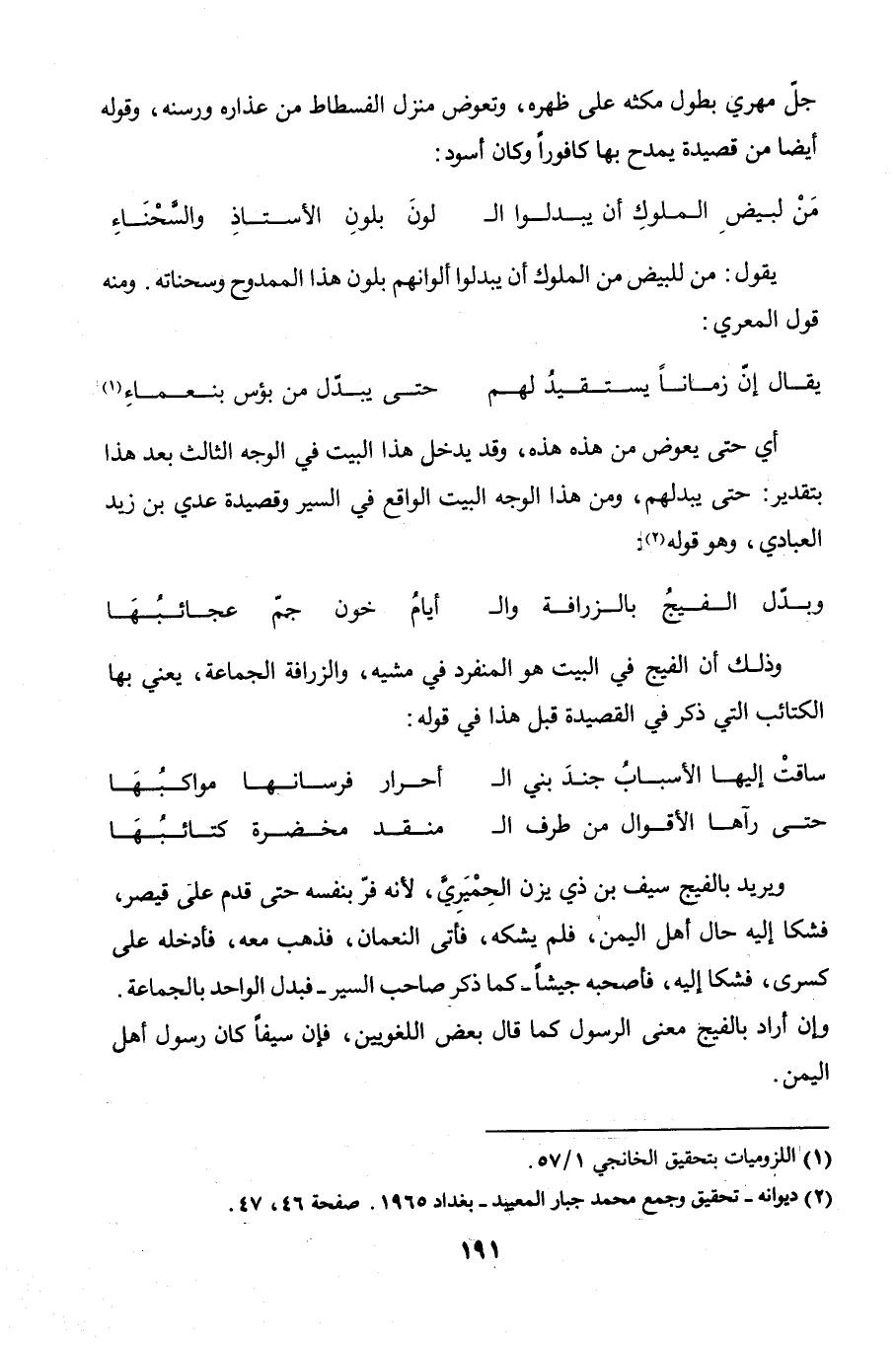 وذلك أن الفيج في البيت هو المنفرد في مشيه، والزّرافة الجماعة، يعني بها الكتائب التي ذكر في القصيدة قبل هذا في قوله: