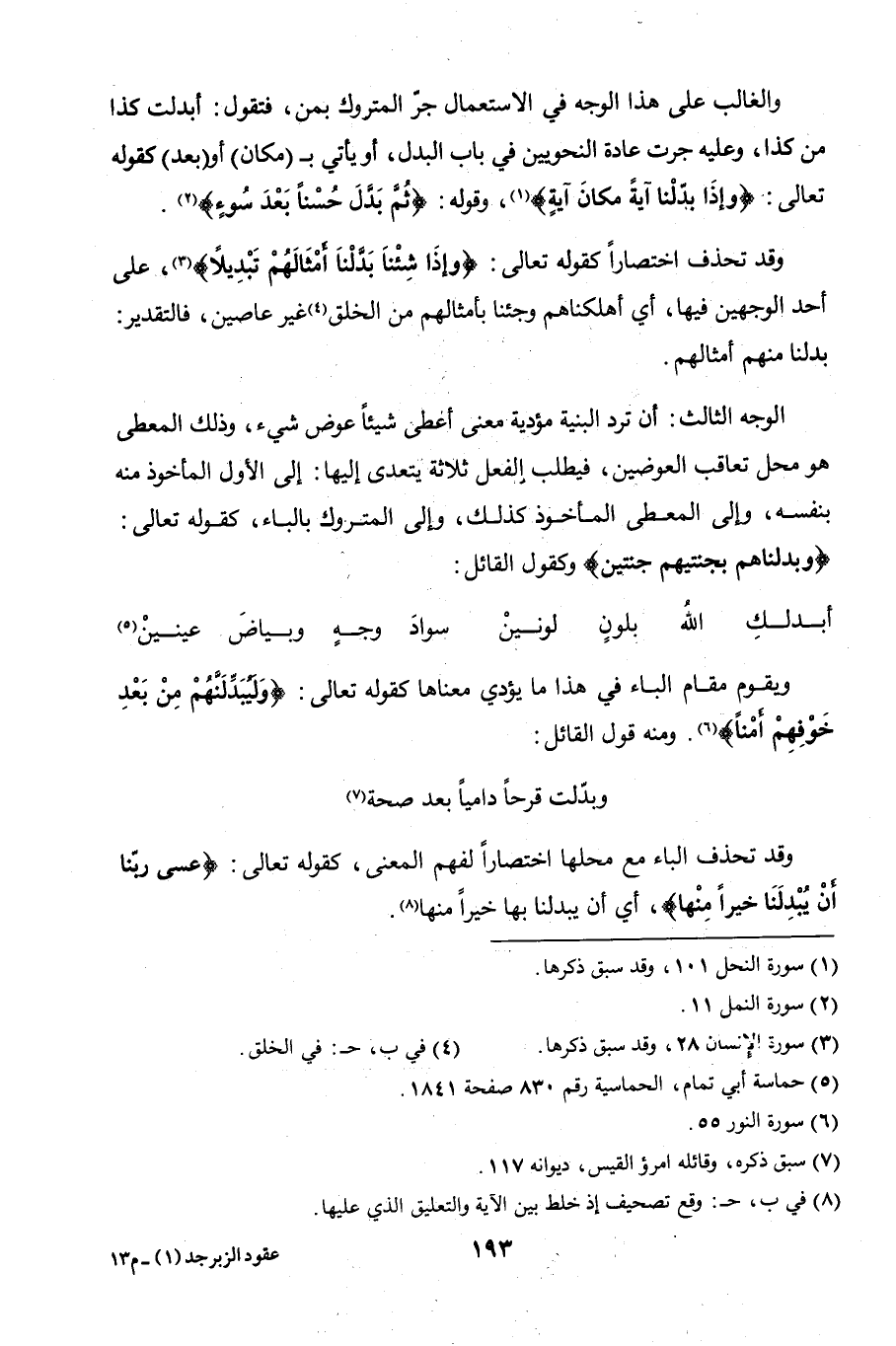 أن ترد البنية مؤدّية معنى أعطى مُعطَى شيئا عوض شيء، وذلك المعطى هو محل تعاقب العوضين، فيطلب الفعل ثلاثة يتعدى إليها، إلى الآذن المأخوذ منه بنفسه، والى المعطى المأخوذ كذلك، وإلى المتروك بالباء. كقوله تعالى: {وبَدَّلْناهُمْ بِجنَّتيْهم جنَّتين}، وكقول القائل: