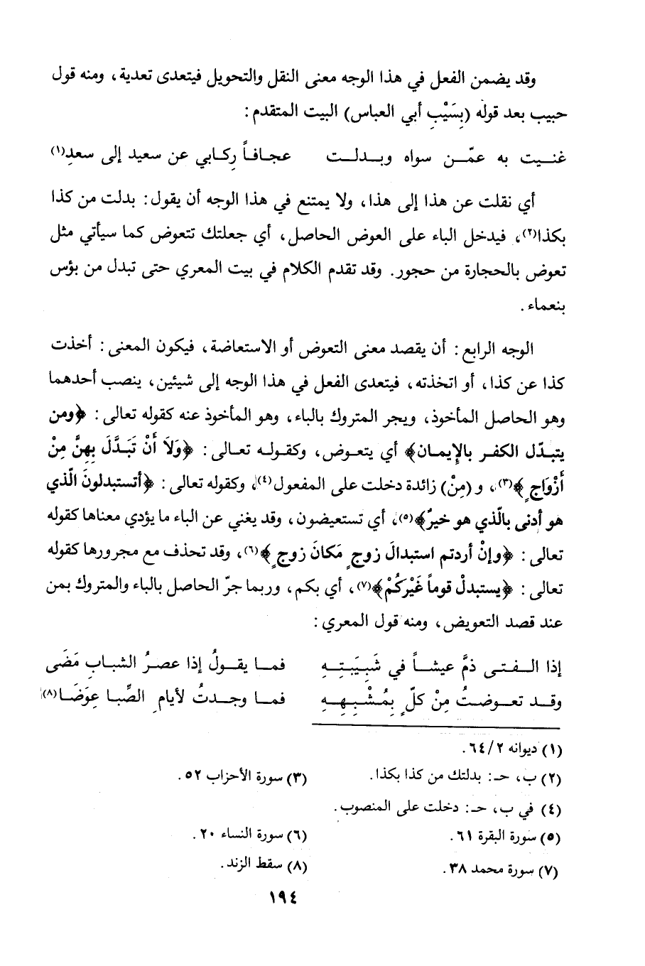 أن يقصد معنى التعوض أو الاستعاضة، فيكون المعنى أخذت كذا عن كذا أو استخذته، فيتعدى الفعل في هذا الوجه إلى شيئين ينصب أحدهما وهو الحاصل المأخوذ، ويجرّ المتروك بالباء وهو المأخوذ عنه. كقوله تعالى: {ومَنْ يتَبدَّل الكُفْرَ بالإِيمان} أي يتعوض، وكقوله: {ولا أنْ تبدَّلَ بهنَّ مِنْ أزواج} و"من" زائدة دخلت على المنصوب. وكقوله تعالى: {أَتَسْتَبْدِلُونَ الَّذِي هُوَ أَدْنَى بِالَّذِي هُوَ خَيْرٌ} أي تستعيضون.