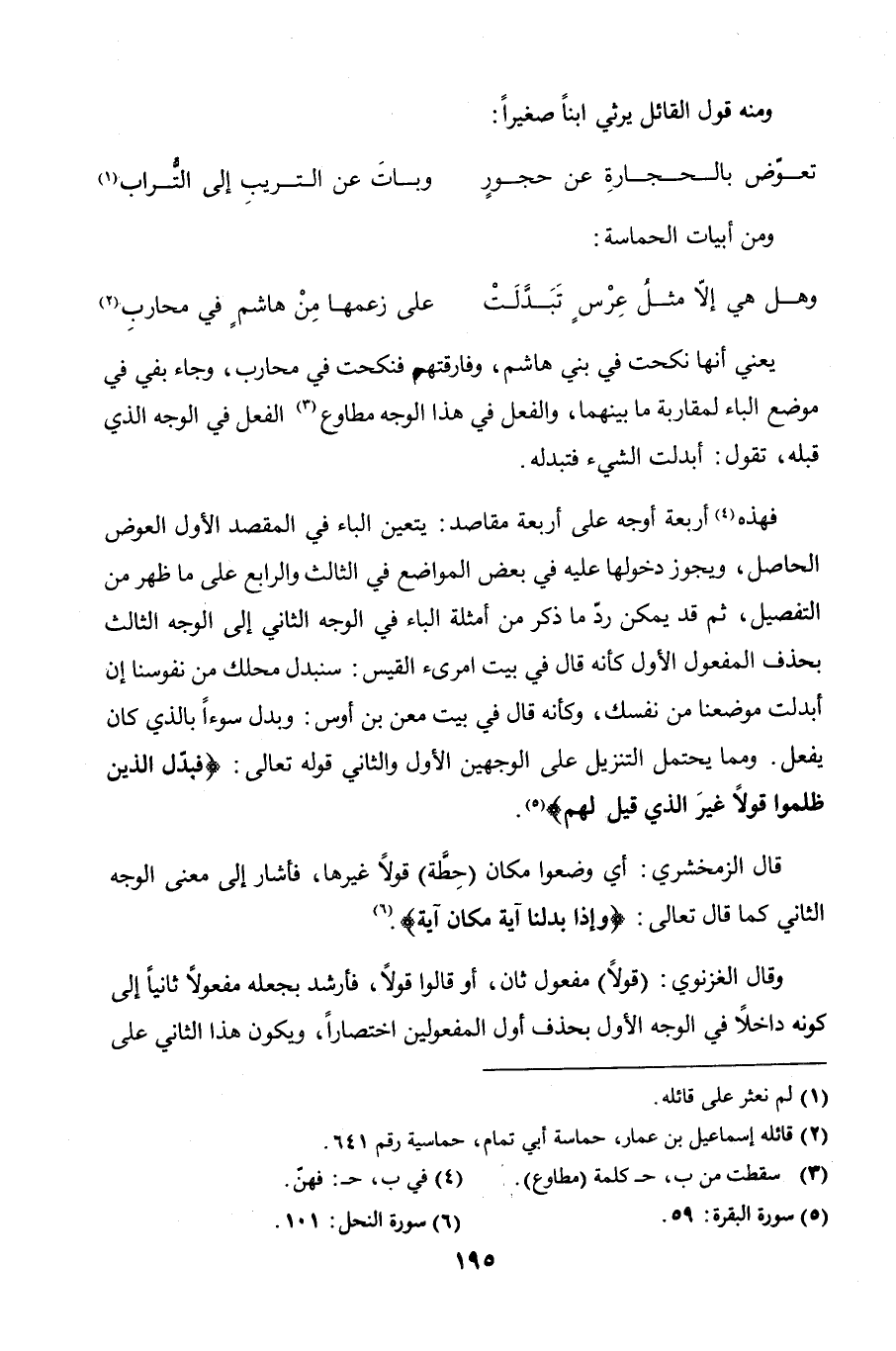 ثم قد يمكن ردّ ما ذكر من أمثلة الباء في الوجه الثاني إلى الوجه الثالث بحذف المفعول الأول، كأنه قال في بيت امرىء القيس: سنبدل محلك من نفوسنا إن أبدلت موضعنا من نفسك. وكأنه قال في بيت معن بن أوس: