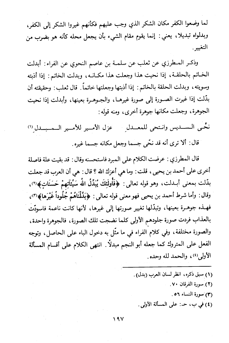قال المطرّز: عرضت الكلام على المّبرد فاستحسنه. وقال لي: قد بقيت لي عليه فاصلة أخرى على أحمد بن يحي. قلت: وماهي؟ أعزّك الله. قال: هي أن العرب قد جعلت بدّلت بمعنى أبدلت، وهو قوله تعالى: {فَأُولَئِكَ يُبَدِّلُ اللَّهُ سَيِّئَاتِهِمْ حَسَنَاتٍ} [ألا ترى أنه قد أزال السيئات وجعل مكانها حسنات]. قال: وأما شرط أحمد بن يحي فهو معنى قوله تعالى: {بَدَّلْنَاهُمْ جُلُوداً غَيْرَهَا}. فهذه [هي] الجوهرة بعينها، وتبديلها تغيير صورتها إلى غيرها، لأنها كانت ناعمة فاسودّت بالعذاب فردّت صورة جلودهم الأولى كلما نضجت تلك الصورة، فالجوهرة واحدة والصور مختلفة.