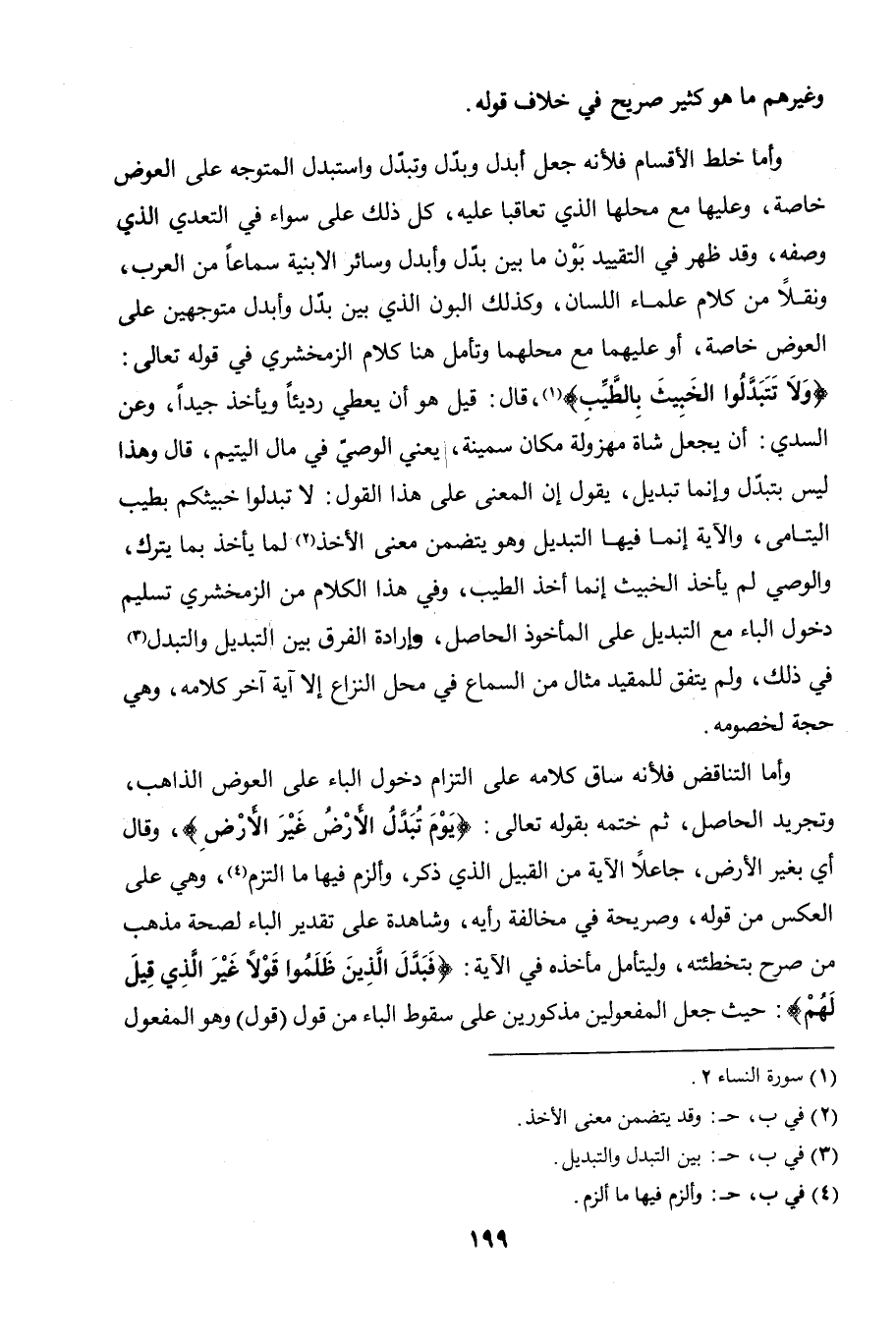 وتأمل هنا كلام الزمخشري في قوله تعالى: {وَلا تَتَبَدَّلُوا الْخَبِيثَ بِالطَّيِّبِ} قال: وقيل هو أن يعطي رديئا ويأخذ جيدا. وعن السُّدّي أن يجعل شاة مهزولة مكان سمينة، يعني الوصي في مال اليتيم. قال: وهذا ليس بتبدّل إنما هو تبديل، يقول: إن المعنى على هذا القول لا تبدلوا خبيثكم بطيب اليتامى. والآية إنما فيها التبديل. وقد يتضمن معنى الأخذ لما يأخذ بما يترك، والوصيّ لم يأخذ الخبيث إنما أخذ الطيب.
