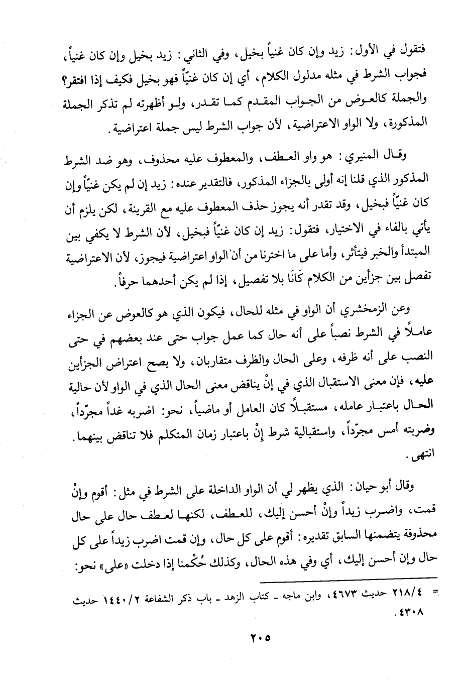 فتقول في الأوّل: زيدٌ وإن كان غنياً بخيل، وفي الثاني: زيدٌ بخيل وإن كان غنياً. فجواب الشرط في مثله مدلول الكلام، أي إذا كان غنياً فهو بخيل، فكيف إذا افتقر، والجملة كالعوض من الجواب المقدّر، كما تقرر، ولو أظهرته لم تذكر الجملة المذكورة ولا الواو الاعتراضية، لأن جواب الشرط ليس جملة اعتراضية. وقال الجنزي: هو واو العطف، والمعطوف عليه محذوف، وهو ضدّ الشرط المذكور، الذي قلنا إنه [هو] الأولى بالجزاء المذكور. فالتقدير عنده: زيدٌ إن لم يكن غنياً وإن كان غنياً فبخيل. وقد تقرر أنه يجوز حذف المعطوف عليه مع القرينة، لكن يلزمه أن يأتي بالفاء في الاختيار، فتقول: زيدٌ وإن كان غنياً فبخيل، لأن الشرط لا يلغى بين المبتدأ والخبر اختيارا. وأما على ما اخترنا من أن الواو اعتراضية فيجوز، لأن الاعتراضية تفصل بين أي جزأين من الكلام كانا بلا تفصيل إذا لم يكن أحدهما حرفا. وعن الزمخشري أن الواو في مثله للحال، فيكون الذي هو كالعوض عن الجزاء عاملا في الشرط نصبا على أنه حال، كما عمل جواب "متى" عند بعضهم في "متى" النصب على أنه ظرفه، ومعنى الحال والظرف متقاربان. ولا يصح اعتراض الجنزي عليه، فإن معنى الاستقبال الذي في "إنْ" يناقض معنى الحال الذي في الواو، لأن حالية الحال باعتبار عامله مستقبلاً كان العامل أو ماضيا نحو: اضربه غدا مجرداً، وضربته أمس مجردا، واستقبالية شرط "إنْ" باعتبار زمان المتكلم، فلا تناقض بينهما". انتهى.