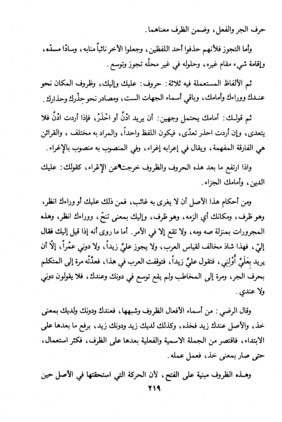 حرف الجر والفعل، وضمّن الظرف معناهما. وأما التجّوز فلأنهم حذفوا أحد اللفظين وجعلوا الآخر نائباً منابه وسادا مسدّه. وإقامة الشيء مقام غيره وحلوله في غير محلّه تجّوز وتوسّع. ثم الألفاظ المستعملة فيه ثلاثة ضروب: عليك وإليك، وظروف المكان نحو عندك ووراءك وأمامك وباقي أسماء الجهات الست، ومصادر نحو حِذْرَك وحذارك. ثم قولك "أمامك" يحتمل وجهين: أن يريد ادْنُ، أو احذر. فإن أردت ادْنُ فلا يتعدّى، وإن أردت احذر تعدّى. فيكون اللفظ واحداً والمراد به مختلف، والقرائن هي الفارقة المفهمة. ويقال في إعرابه إغراء، وفي المنصوب به منصوب بالإِغراء. وإذا ارتفع ما بعد هذه الحروف أو الظروف خرجت عن الإغراء، كقولك: عليك الدَّينُ، وأمامك الجزاءُ. ومن أحكام هذا الأصل أن لا يُغْري به غائب. فمن ذلك: عليك عمراً، ووراءك انظر، وهو ظرف. ومكانك أي الزمه- وهو ظرف. وإليك بمعنى تنح. ووراءك انظر. وهذه المجرورات بمنزلة صَهْ ومَهْ، ولا يقع إلا في الأمر. أما ما روي أنه إذا قيل إليك، فقال: إليَّ، فهذا شاذ مخالف لقياس العرب، ولا يجوز علىَّ زيداً ولا دوني عمراً، إلا أن يريد بعليّ أوْلِني، فيقول: عليّ زيداً، فتوسعت العرب في هذا، فعدَّته مرة إلى المتكلم بحرف الجر، ومرّة إلى المخاطب. ولم يقع توسّع في دونك وعندك. فلا يقولون دوني ولا عندي". انتهى.