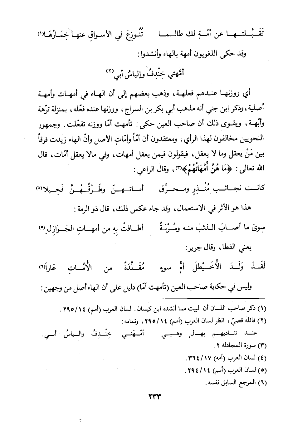 أي ووزنها عندهم فعلهة، وذهب بعضهم إلى أن الهاء في أمهات وأمهة أصلية، وذكر ابن جني أنه مذهب أبي بكر بن السراج، ووزنها عنده فعّلة، بمنزلة ترّهة وأبّهة، ويقوى ذلك أن صاحب العين حكى: تأمهت أمّا ووزنه تفعّلت. وجمهور النحويين مخالفون لهذا الرأي، ومعتقدون أن أمًّا وأمّاتٍ الأصل وأنّ الهاء زيدت فرقًا بين من يعقل وما لا يعقل، فيقولون فيمن يعقل أمهات، وفي مالا يعقل أمّات، قال الله تعالى: (ما هنّ أمّهاتُهم)، وقال الراعي: