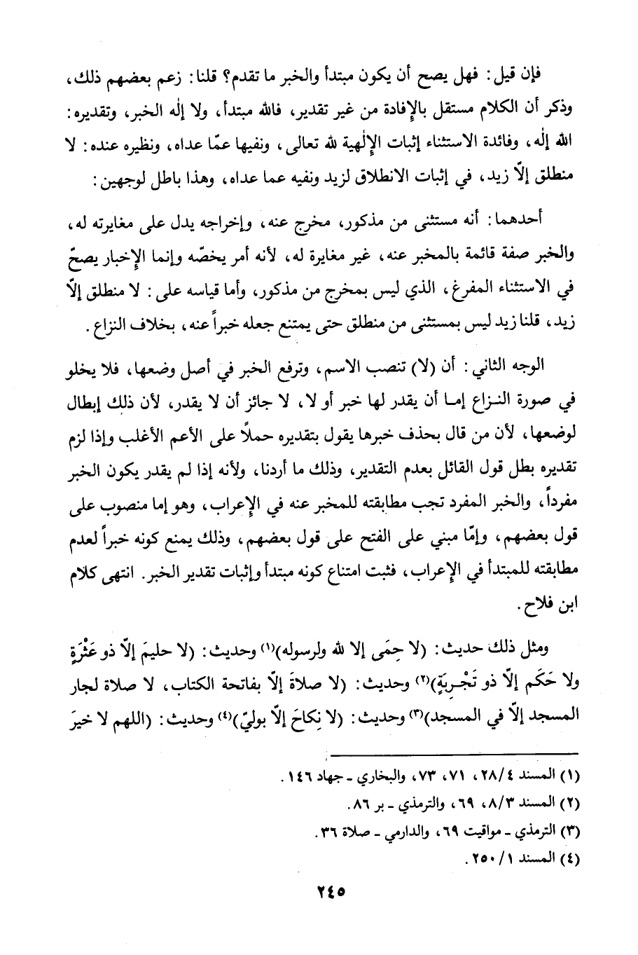 ومثل ذلك حديث: (لا حِمى إلا لله ولرسوله) وحديث: (لا حليمَ إلاّ ذو عَثْرَةٍ ولا حَكَم إلاّ ذو تجربةٍ) وحديث: (لا صلاةَ إلاّ بفاتحة الكتاب، لا صلاة لجار المسجد إلاّ في المسجد) وحديث: (لا نِكاح إلاّ بوليّ) وحديث: (اللهم لا خيرَ